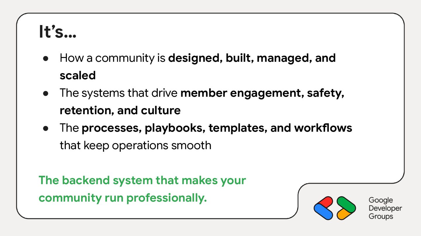 scaled • The systems that drive member engagement, safety, retention, and culture • The processes, playbooks, templates, and workflows that keep operations smooth The backend system that makes your community run professionally.
