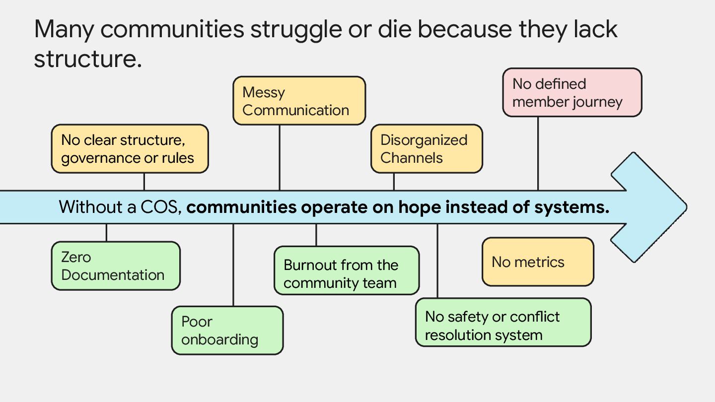 a COS, communities operate on hope instead of systems. Messy Communication No defined member journey No clear structure, governance or rules Disorganized Channels Poor onboarding Zero Documentation Burnout from the community team No safety or conflict resolution system No metrics
