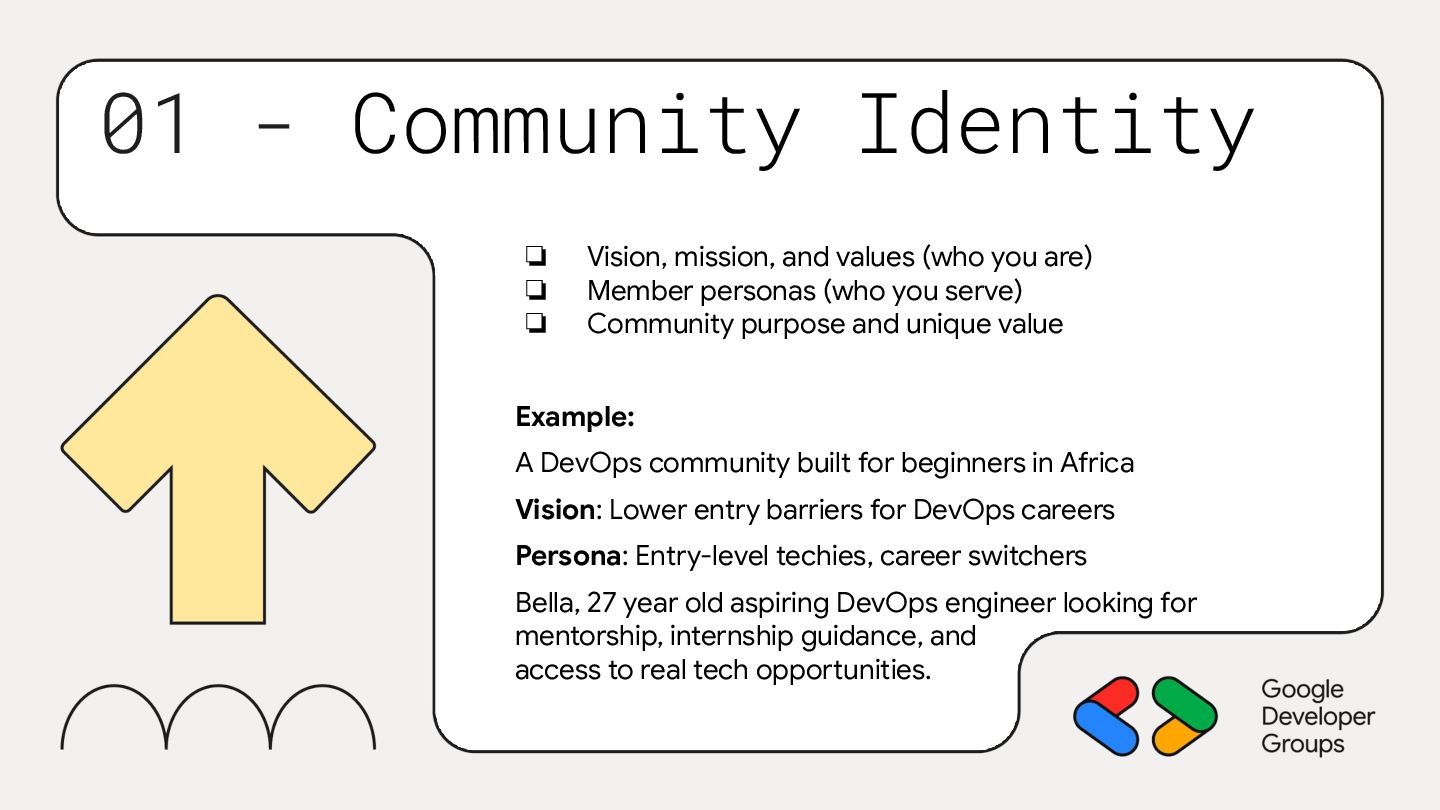 you are) ❏ Member personas (who you serve) ❏ Community purpose and unique value Example: A DevOps community built for beginners in Africa Vision: Lower entry barriers for DevOps careers Persona: Entry-level techies, career switchers Bella, 27 year old aspiring DevOps engineer looking for mentorship, internship guidance, and access to real tech opportunities.