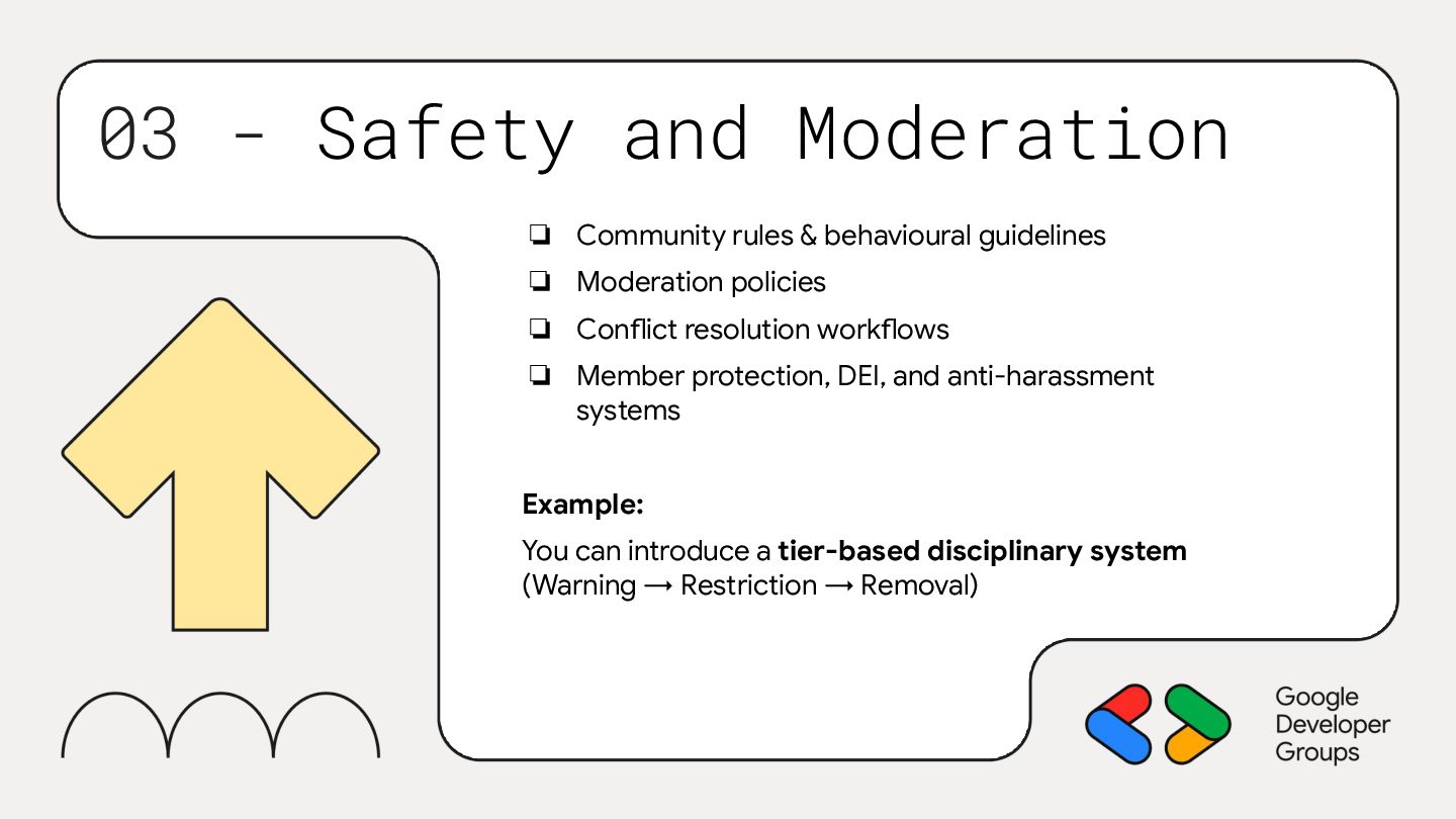 guidelines ❏ Moderation policies ❏ Conflict resolution workflows ❏ Member protection, DEI, and anti-harassment systems Example: You can introduce a tier-based disciplinary system (Warning → Restriction → Removal)