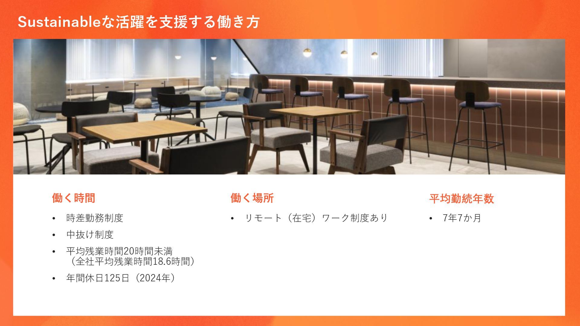 年間休日125日(2024年) 働く場所 • リモート(在宅)ワーク制度あり 平均勤続年数 • 7年7か月