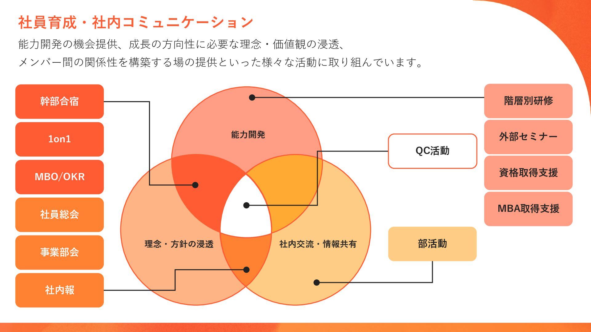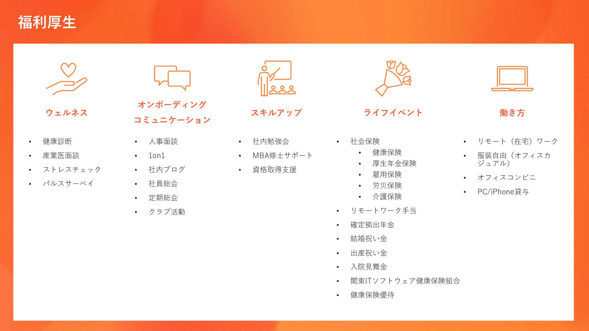 オンボーディング コミュニケーション • 人事面談 • 1on1 • 社内ブログ • 社員総会 • 定期総会 • クラブ活動 スキルアップ • 社内勉強会 • MBA修士サポート • 資格取得支援 ライフイベント • 社会保険 • 健康保険 • 厚生年金保険 • 雇用保険 • 労災保険 • 介護保険 • リモートワーク手当 • 確定拠出年金 • 結婚祝い金 • 出産祝い金 • 入院見舞金 • 関東ITソフトウェア健康保険組合 • 健康保険優待 働き方 • リモート(在宅)ワーク • 服装自由(オフィスカ ジュアル) • オフィスコンビニ • PC/iPhone貸与