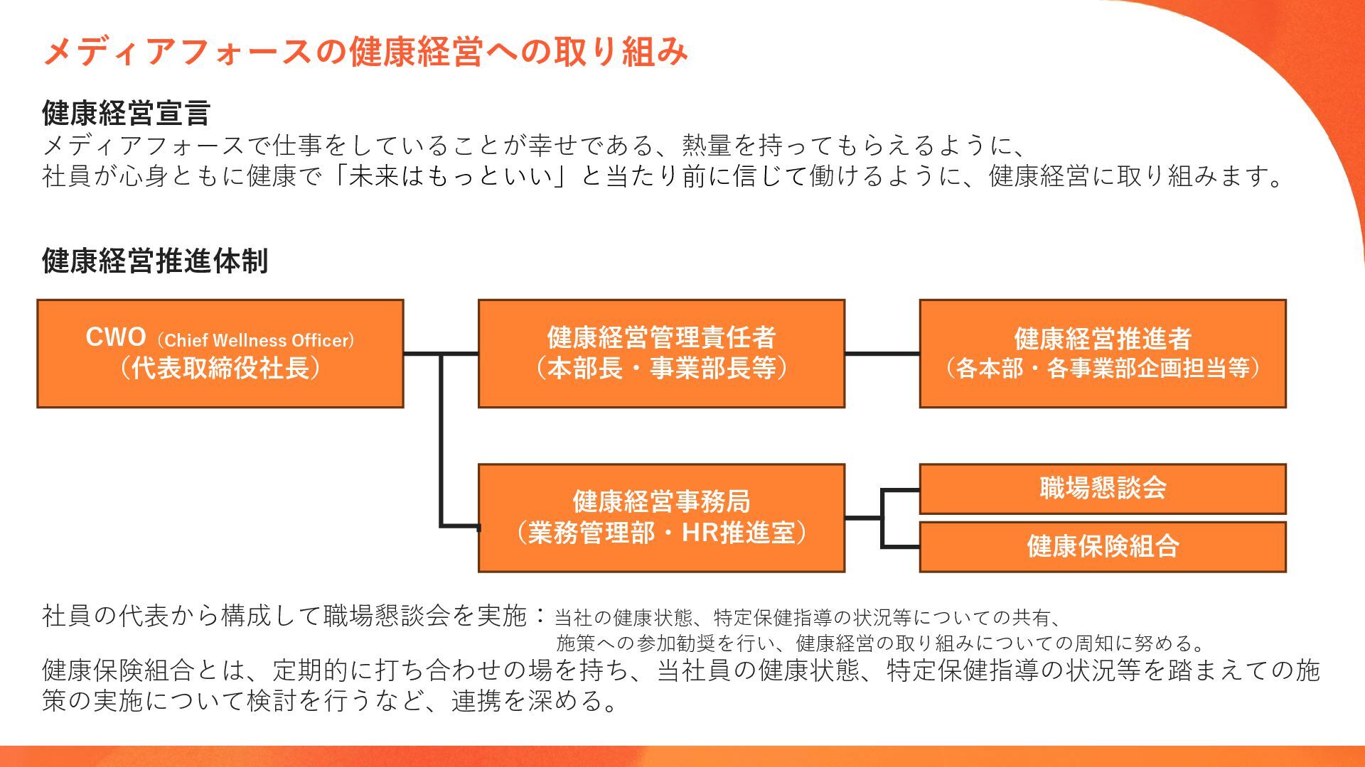 6. メディアフォースの健康経営への取り組み 健康経営宣言 メディアフォースで仕事をしていることが幸せである、熱量を持ってもらえるように、 社員が心身ともに健康で「未来はもっといい」と当たり前に信じて働けるように、健康経営に取り組みます。 健康経営推進体制 CWO(Chief Wellness Officer) (代表取締役社長) 健康経営管理責任者