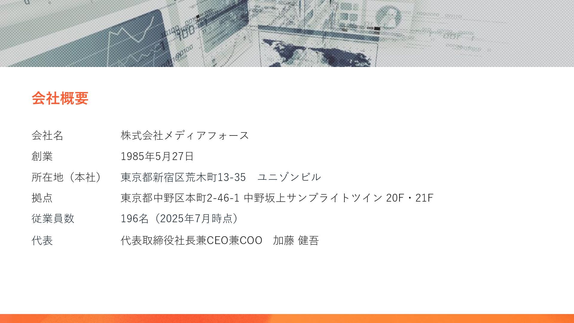 196名(2025年7月時点) 代表 代表取締役社長兼CEO兼COO 加藤 健吾 東京都新宿区荒木町13-35 ユニゾンビル 所在地(本社)
