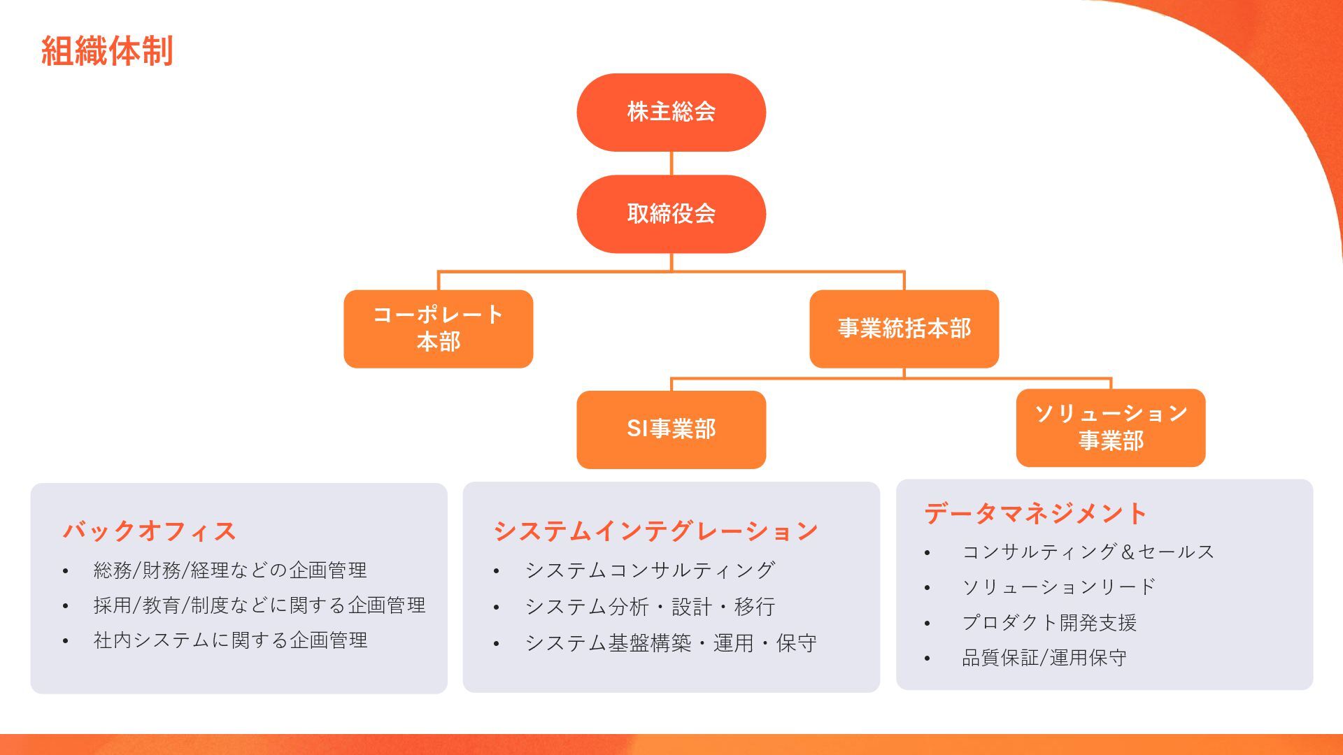 コンサルティング&セールス • ソリューションリード • プロダクト開発支援 • 品質保証/運用保守 バックオフィス • 総務/財務/経理などの企画管理 • 採用/教育/制度などに関する企画管理 • 社内システムに関する企画管理 株主総会 取締役会 事業統括本部 コーポレート 本部 SI事業部 ソリューション 事業部