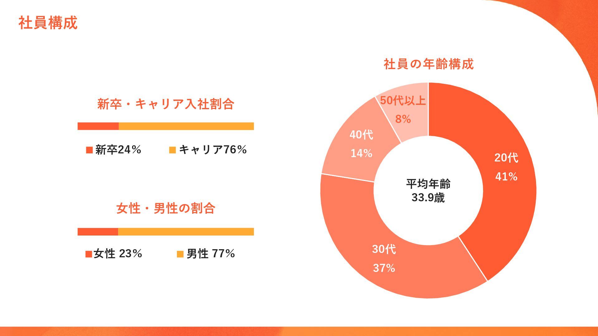平均年齢 33.9歳 新卒・キャリア入社割合 新卒24% キャリア76% 女性・男性の割合 女性 23% 男性 77%