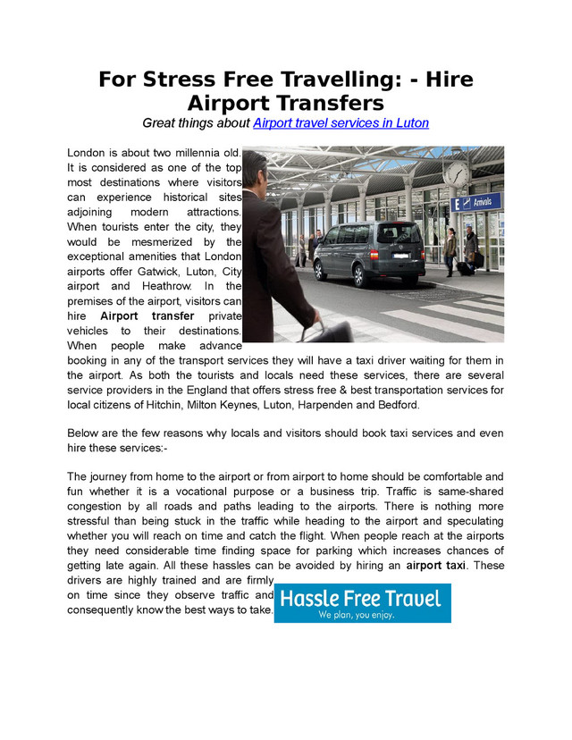 about Airport travel services in Luton London is about two millennia old. It is considered as one of the top most destinations where visitors can experience historical sites adjoining modern attractions. When tourists enter the city, they would be mesmerized by the exceptional amenities that London airports offer Gatwick, Luton, City airport and Heathrow. In the premises of the airport, visitors can hire Airport transfer private vehicles to their destinations. When people make advance booking in any of the transport services they will have a taxi driver waiting for them in the airport. As both the tourists and locals need these services, there are several service providers in the England that offers stress free & best transportation services for local citizens of Hitchin, Milton Keynes, Luton, Harpenden and Bedford. Below are the few reasons why locals and visitors should book taxi services and even hire these services:- The journey from home to the airport or from airport to home should be comfortable and fun whether it is a vocational purpose or a business trip. Traffic is same-shared congestion by all roads and paths leading to the airports. There is nothing more stressful than being stuck in the traffic while heading to the airport and speculating whether you will reach on time and catch the flight. When people reach at the airports they need considerable time finding space for parking which increases chances of getting late again. All these hassles can be avoided by hiring an airport taxi. These drivers are highly trained and are firmly on time since they observe traffic and consequently know the best ways to take.