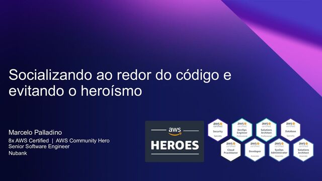 rights reserved. Socializando ao redor do código e evitando o heroísmo Marcelo Palladino 8x AWS Certified | AWS Community Hero Senior Software Engineer Nubank