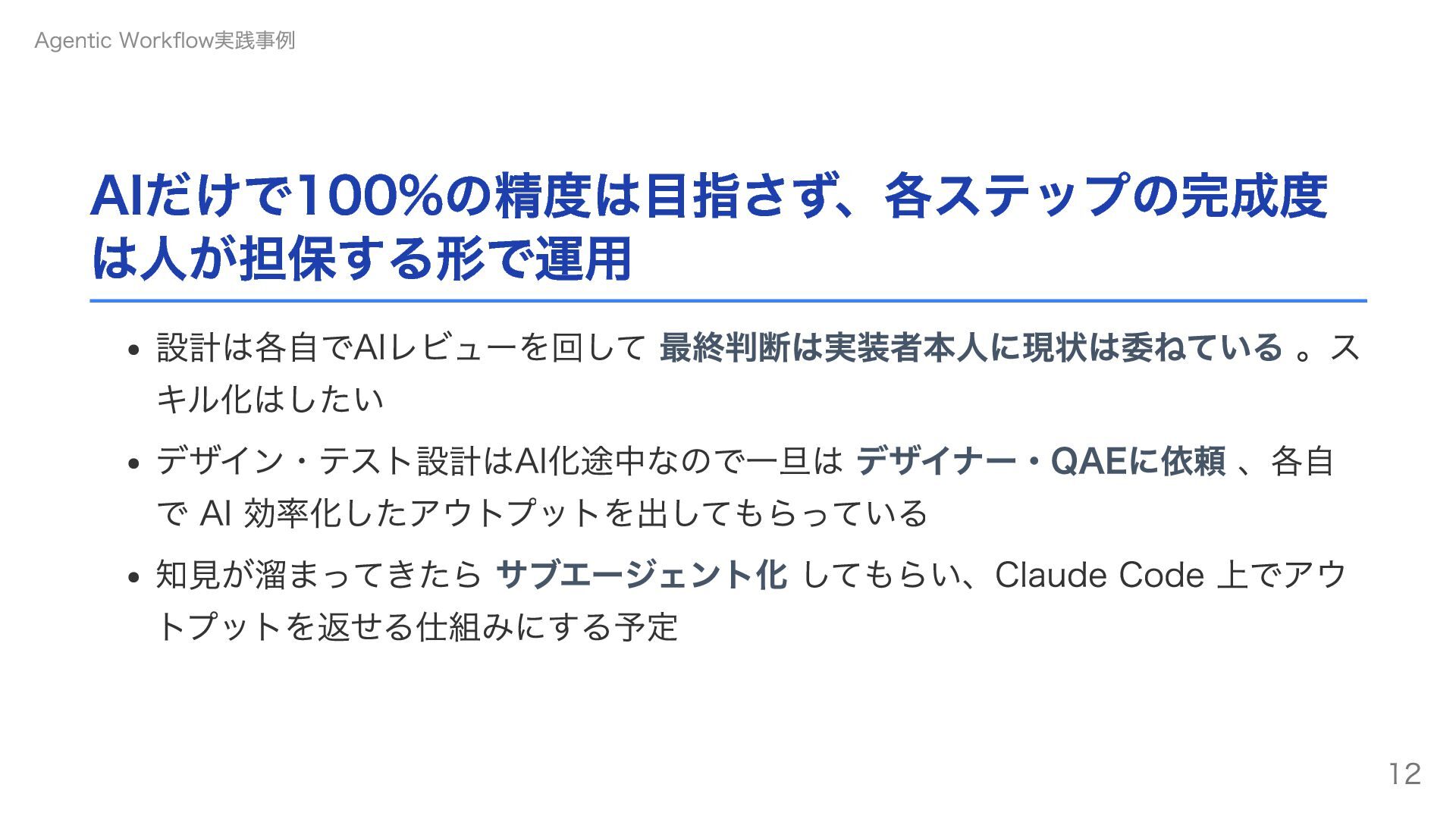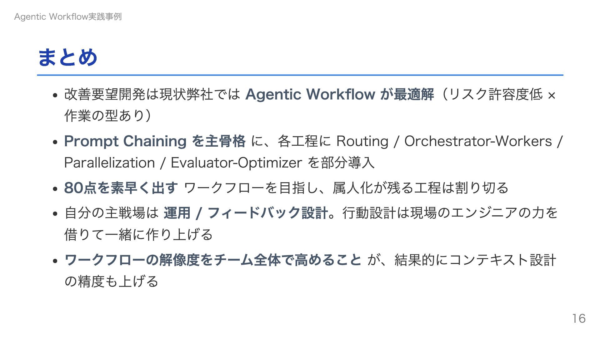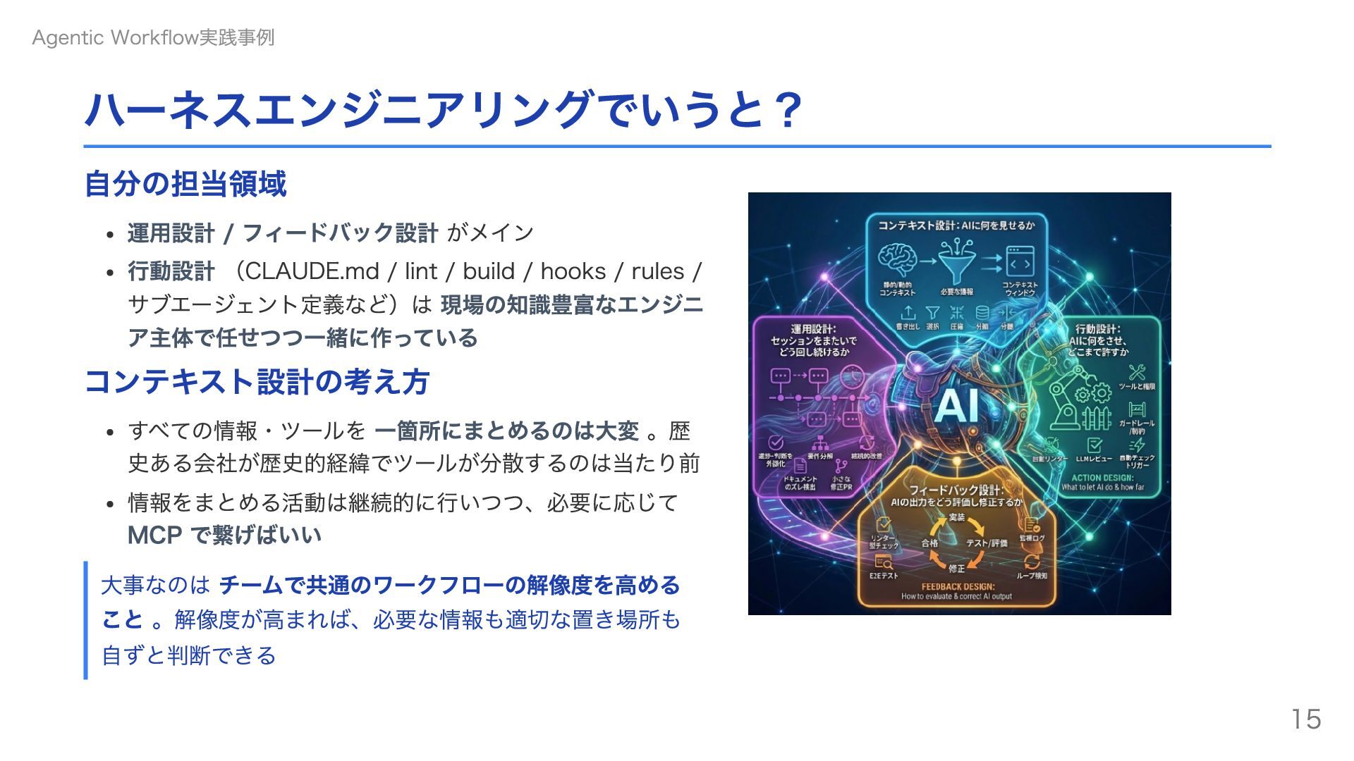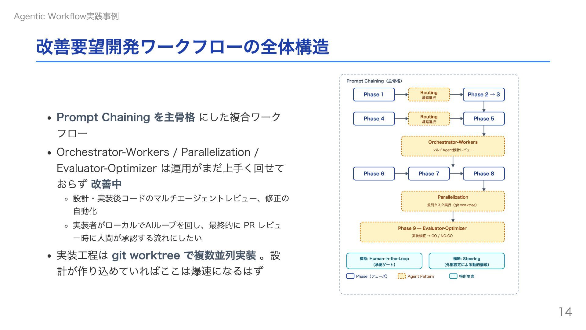 Evaluator-Optimizer は運用がまだ上手く回せて おらず 改善中 設計・実装後コードのマルチエージェントレビュー、修正の 自動化 実装者がローカルでAIループを回し、最終的に PR レビュ ー時に人間が承認する流れにしたい 実装工程は git worktree で複数並列実装 。設 計が作り込めていればここは爆速になるはず Prompt Chaining(主⾻格) Phase 1 Routing 経路選択 Phase 2 → 3 Phase 4 Routing 経路選択 Phase 5 Orchestrator-Workers マルチAgent設計レビュー Phase 6 Phase 7 Phase 8 Parallelization 並列タスク実⾏(git worktree) Phase 9 ̶ Evaluator-Optimizer 実装検証 → GO / NO-GO 横断: Human-in-the-Loop (承認ゲート) 横断: Steering (外部設定による動的構成) Phase(フェーズ) Agent Pattern 横断要素 Agentic Workflow実践事例 14