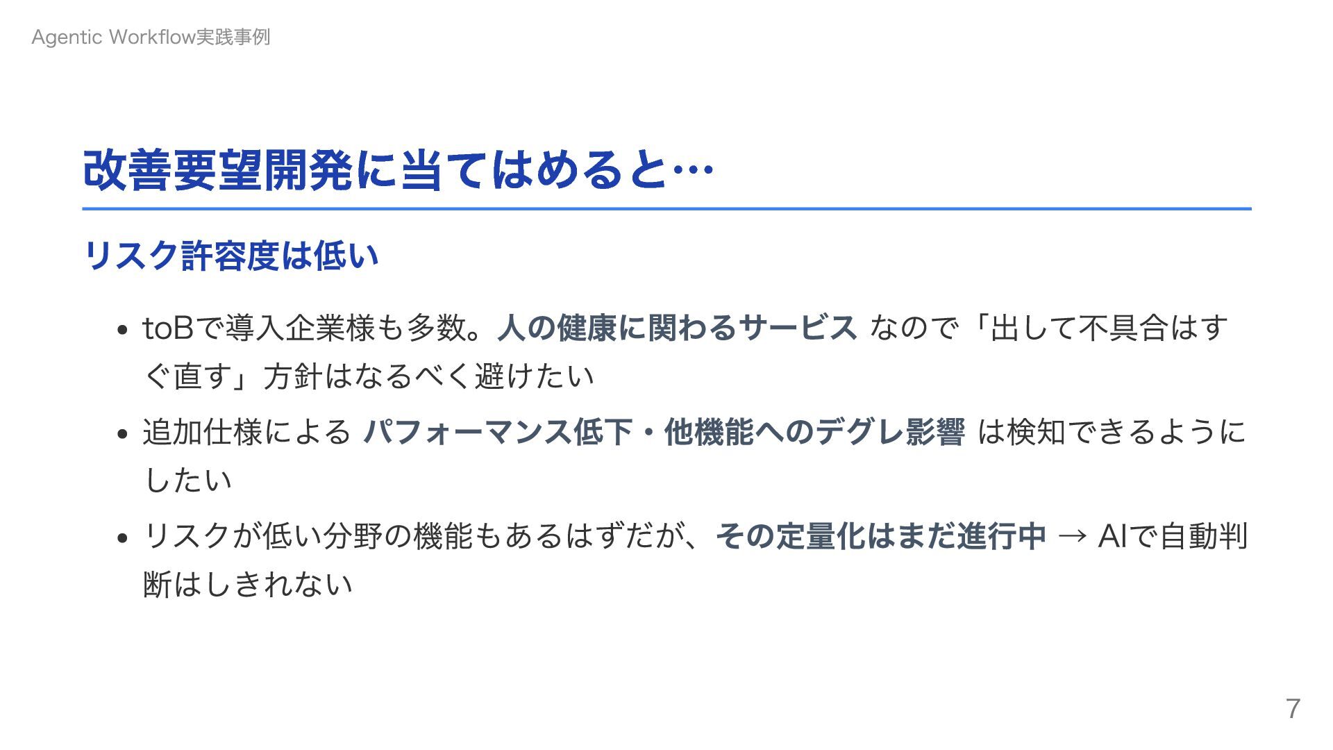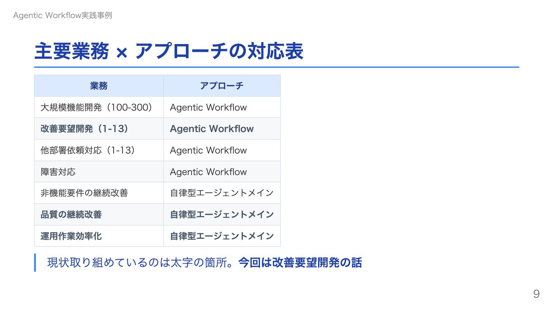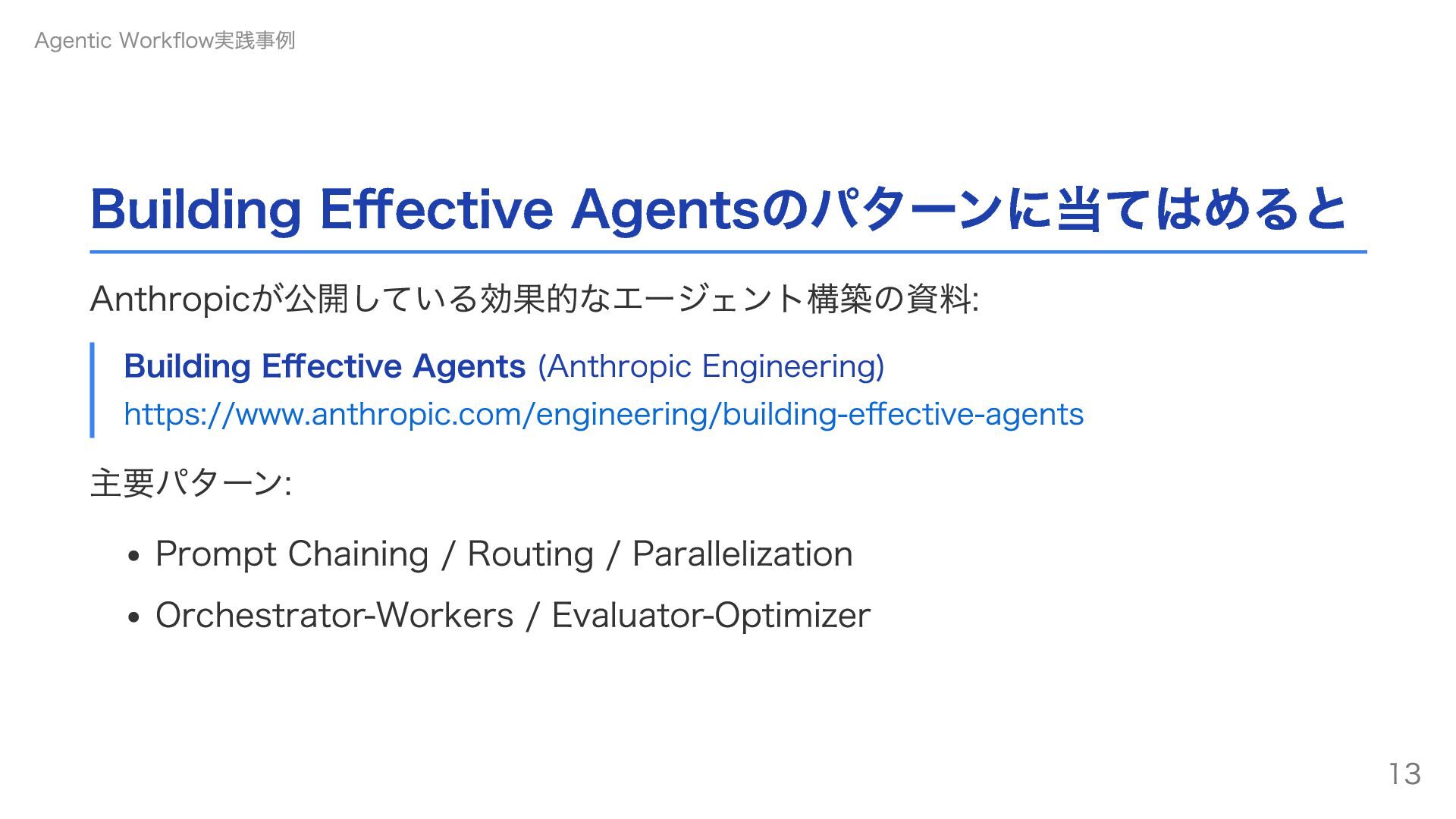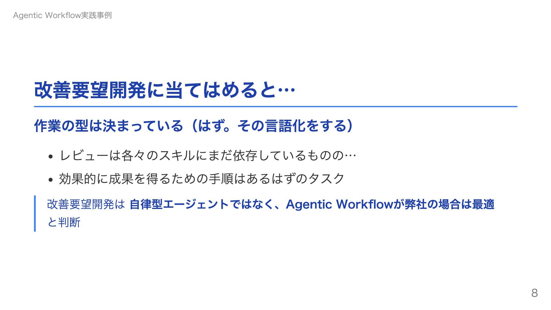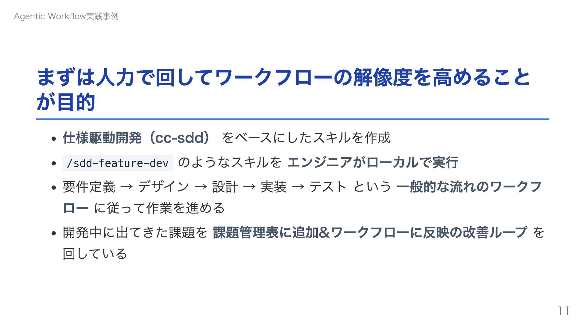 Evaluator-Optimizer は運用がまだ上手く回せて おらず 改善中 設計・実装後コードのマルチエージェントレビュー、修正の 自動化 実装者がローカルでAIループを回し、最終的に PR レビュ ー時に人間が承認する流れにしたい 実装工程は git worktree で複数並列実装 。設 計が作り込めていればここは爆速になるはず Prompt Chaining(主⾻格) Phase 1 Routing 経路選択 Phase 2 → 3 Phase 4 Routing 経路選択 Phase 5 Orchestrator-Workers マルチAgent設計レビュー Phase 6 Phase 7 Phase 8 Parallelization 並列タスク実⾏(git worktree) Phase 9 ̶ Evaluator-Optimizer 実装検証 → GO / NO-GO 横断: Human-in-the-Loop (承認ゲート) 横断: Steering (外部設定による動的構成) Phase(フェーズ) Agent Pattern 横断要素 Agentic Workflow実践事例 14