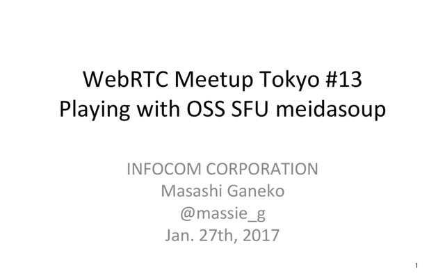 – working for a research team of INFOCOM CORPORATION • WriQng a series of WebRTC on HTML5Experts.jp (HTML5 tech site) – hZps://html5experts.jp/series/webrtc2016/ • English PresentaQon for WebRTC (2013, 2016) – hZps://speakerdeck.com/mganeko • Japanese PresentaQon for WebRTC (2013-‐2016) – hZp://www.slideshare.net/mganeko 2