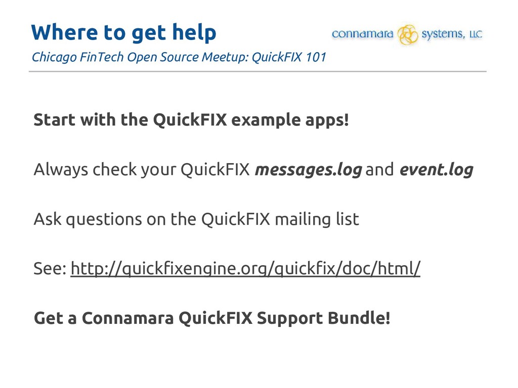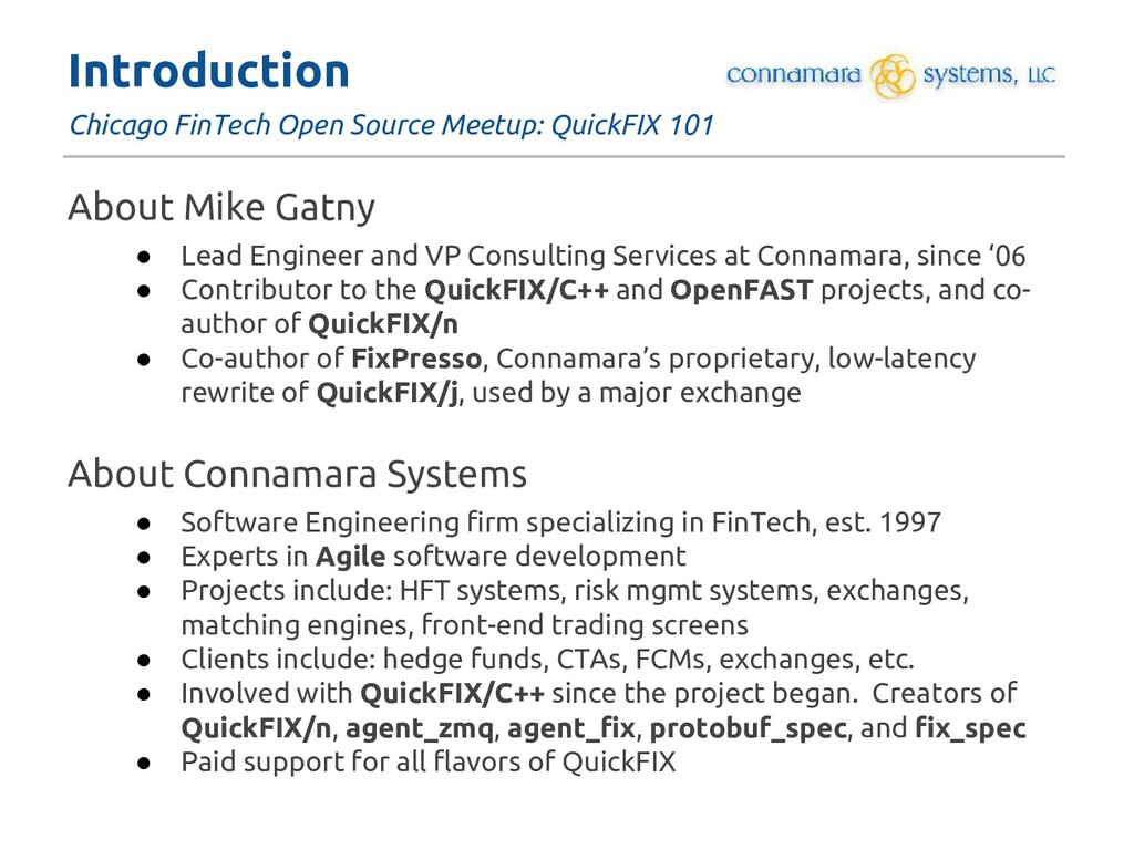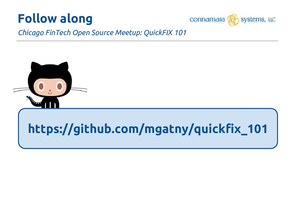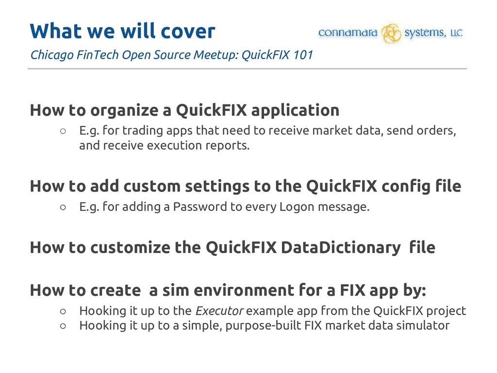 The addition of Cucumber testing using the agent_fix and fix_spec gems was presented at the Chicago FinTech Open Source meetup on November 14, 2013, also hosted by Connamara Systems.