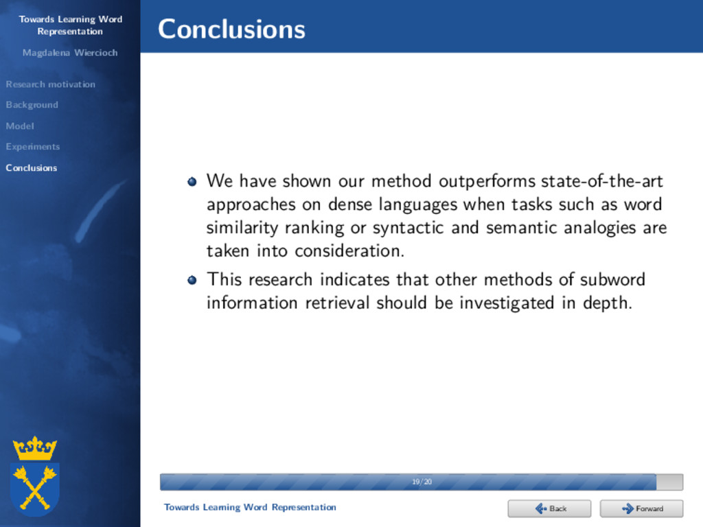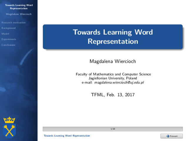 Experiments Conclusions Background Scott Deerwester, Susan T. Dumais, George W. Furnas, Thomas K. Landauer, and Richard Harshman: Indexing by latent semantic analysis. Journal of the American Society for Information Science, 1990. neural networks Hinrich Schütze: Dimensions of meaning. Proceedings of the 1992 ACM/IEEE Conference on Supercomputing, 1992. N. Sakamoto, K. Yamamoto, and S. Nakagawa: Combination of syllable based n-gram search and word search for spoken term detection through spoken queries and iv/oov classification. Automatic Speech Recognition and Understanding (ASRU), 2015. 4/20 4/20 Towards Learning Word Representation Forward Back