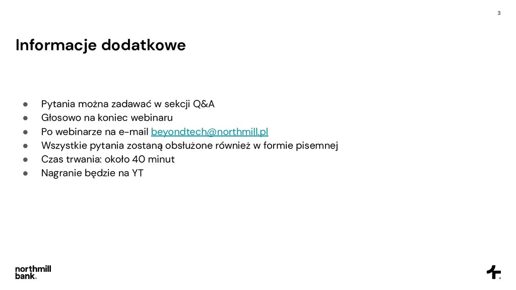 Głosowo na koniec webinaru • Po webinarze na e-mail [email protected] • Wszystkie pytania zostaną obsłużone również w formie pisemnej • Czas trwania: około 40 minut • Nagranie będzie na YT 3