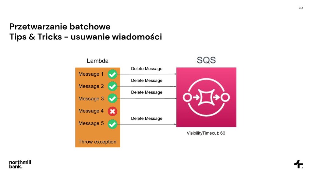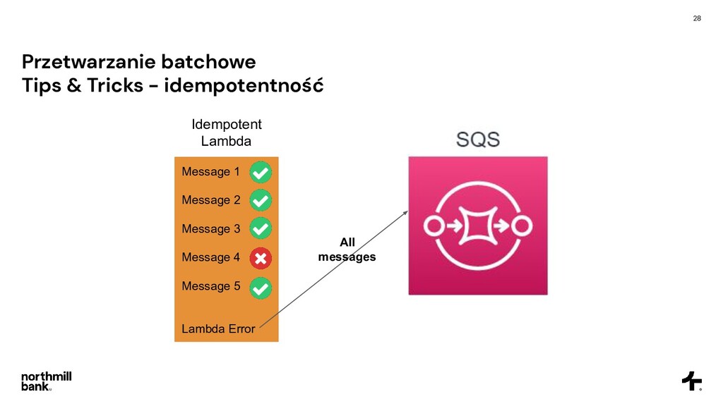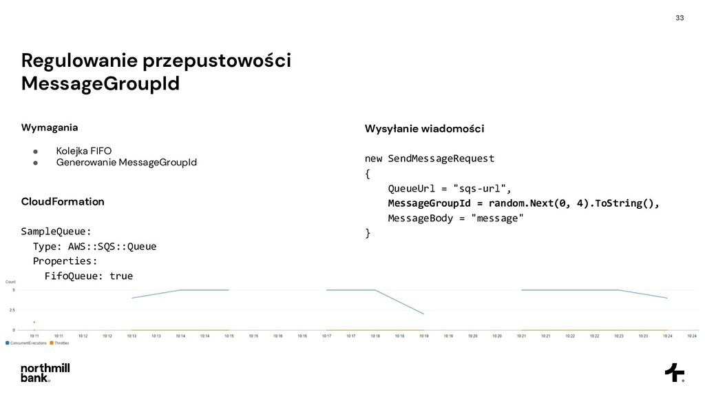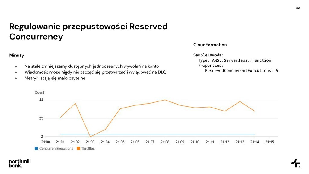 dostępnych jednoczesnych wywołań na konto • Wiadomość może nigdy nie zacząć się przetwarzać i wylądować na DLQ • Metryki stają się mało czytelne CloudFormation SampleLambda: Type: AWS::Serverless::Function Properties: ReservedConcurrentExecutions: 5