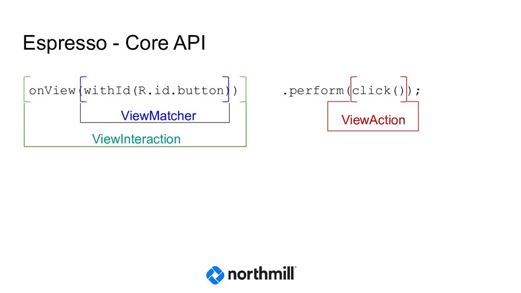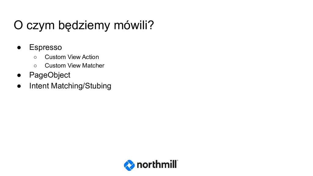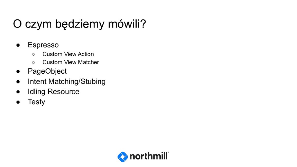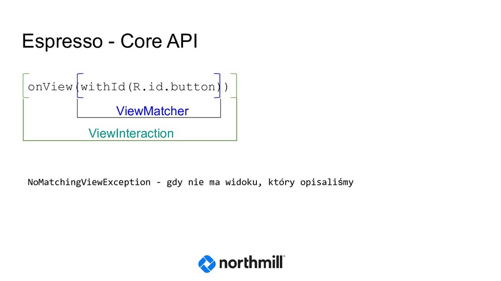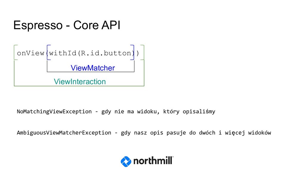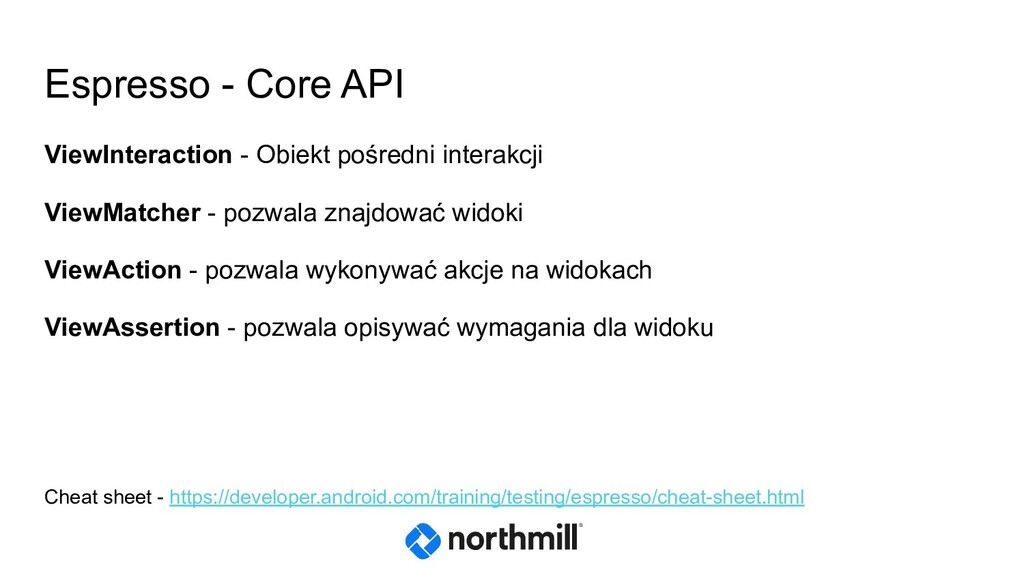 - pozwala znajdować widoki ViewAction - pozwala wykonywać akcje na widokach ViewAssertion - pozwala opisywać wymagania dla widoku Cheat sheet - https://developer.android.com/training/testing/espresso/cheat-sheet.html