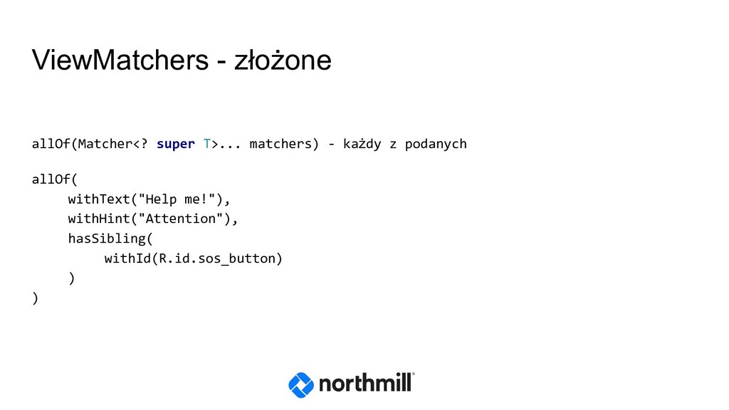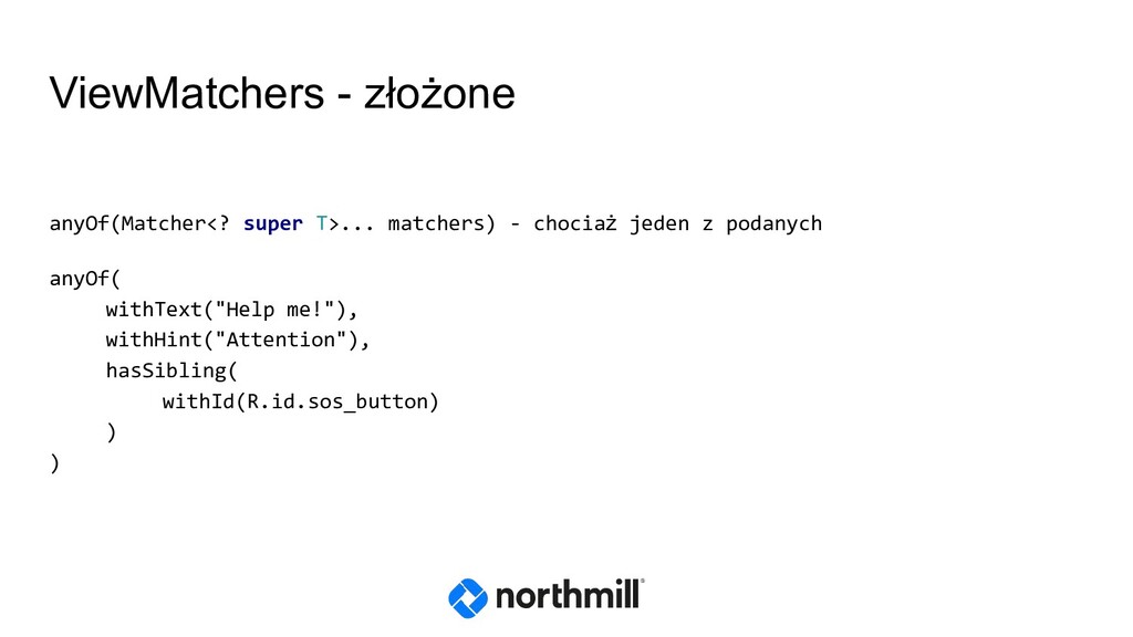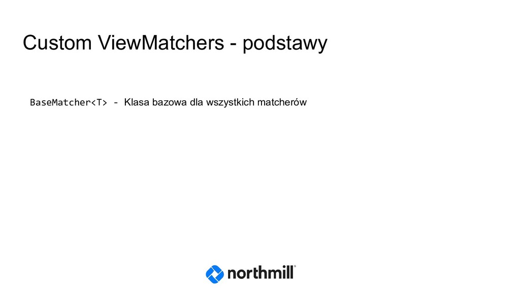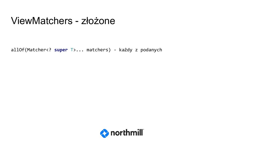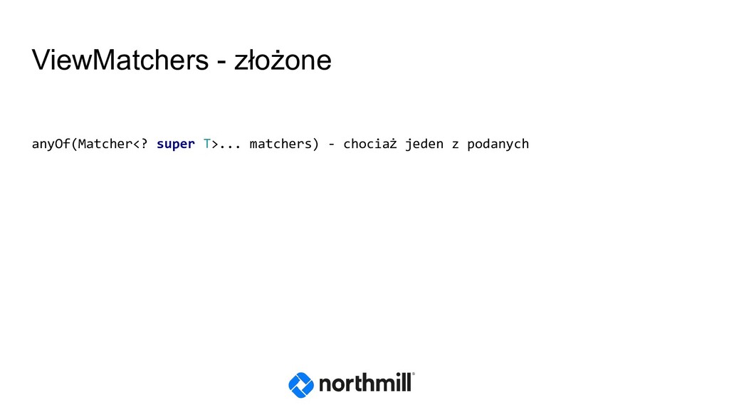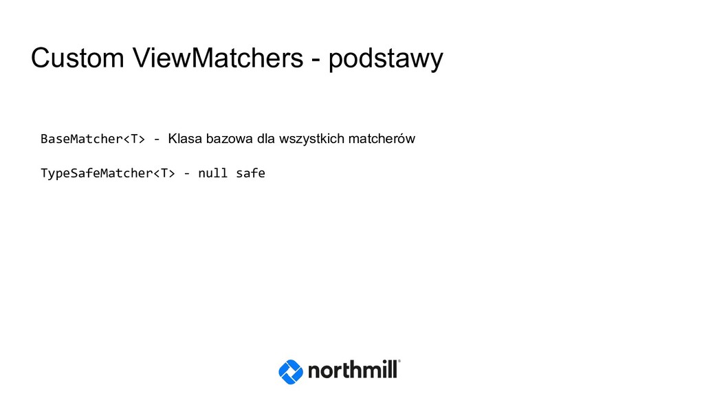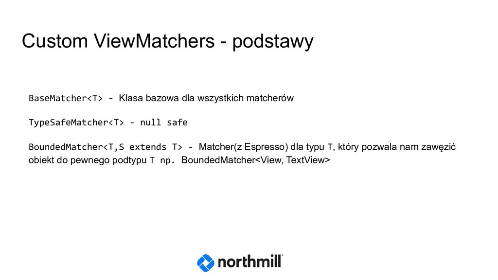 matcherów TypeSafeMatcher<T> - null safe BoundedMatcher<T,S extends T> - Matcher(z Espresso) dla typu T, który pozwala nam zawęzić obiekt do pewnego podtypu T np. BoundedMatcher<View, TextView>