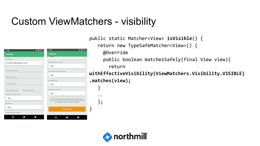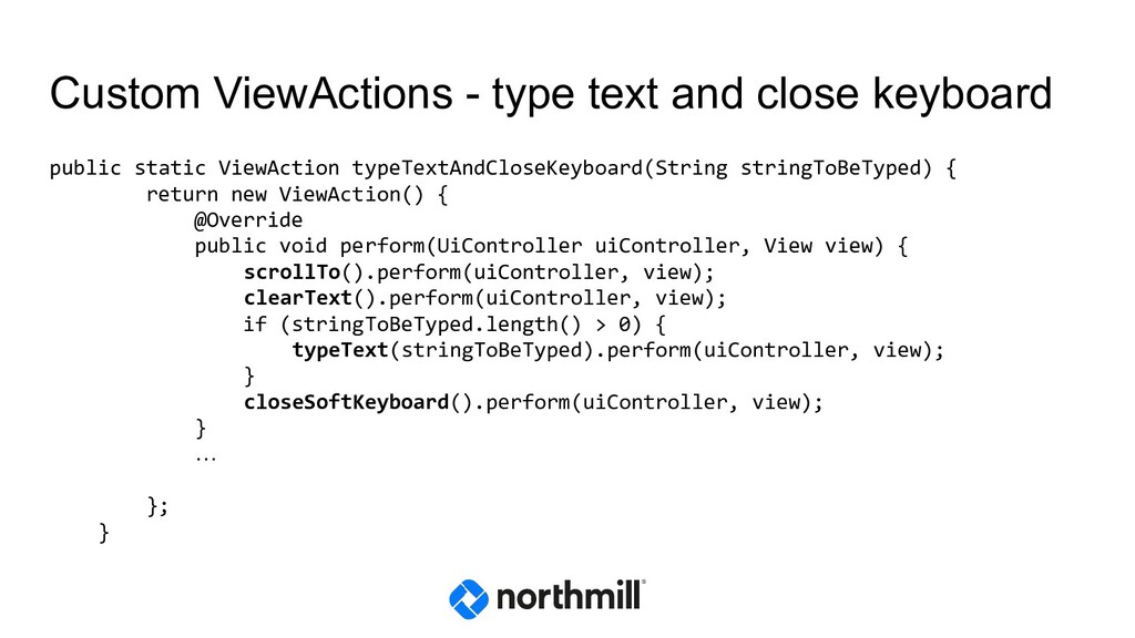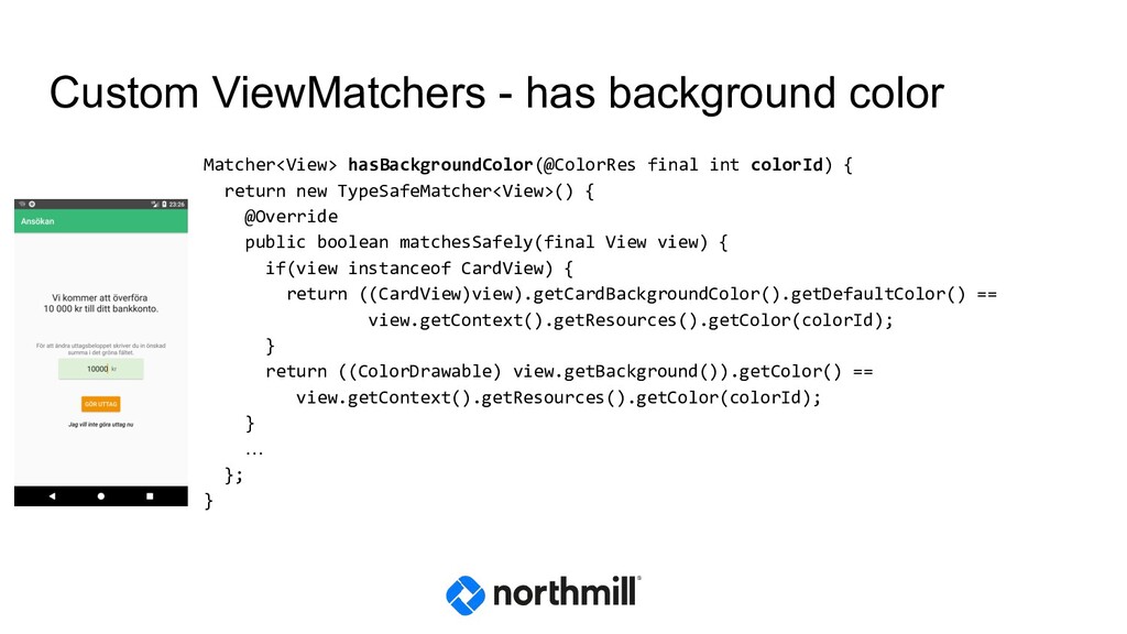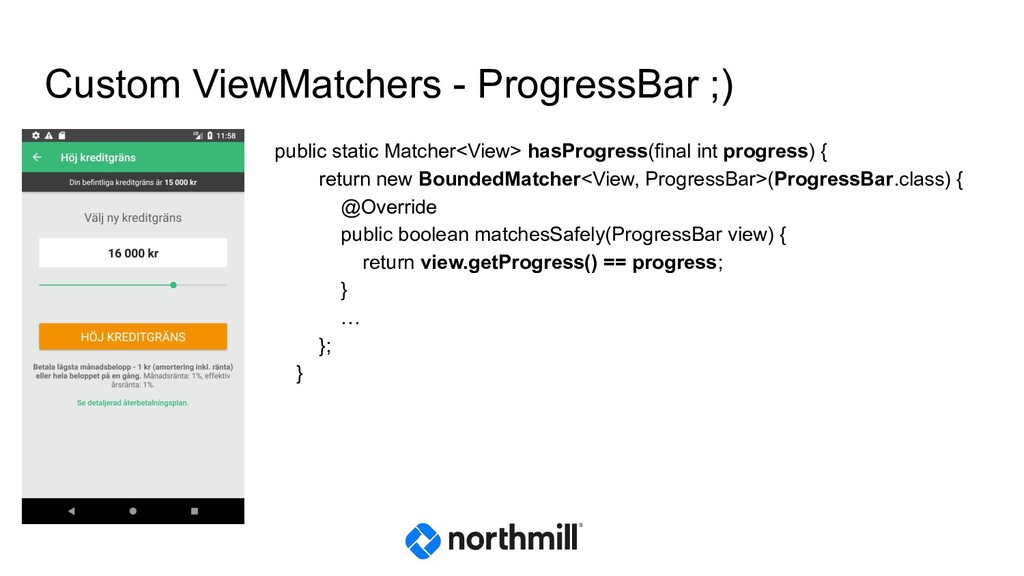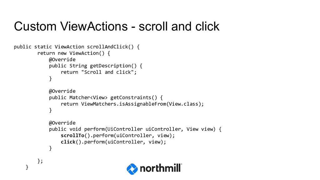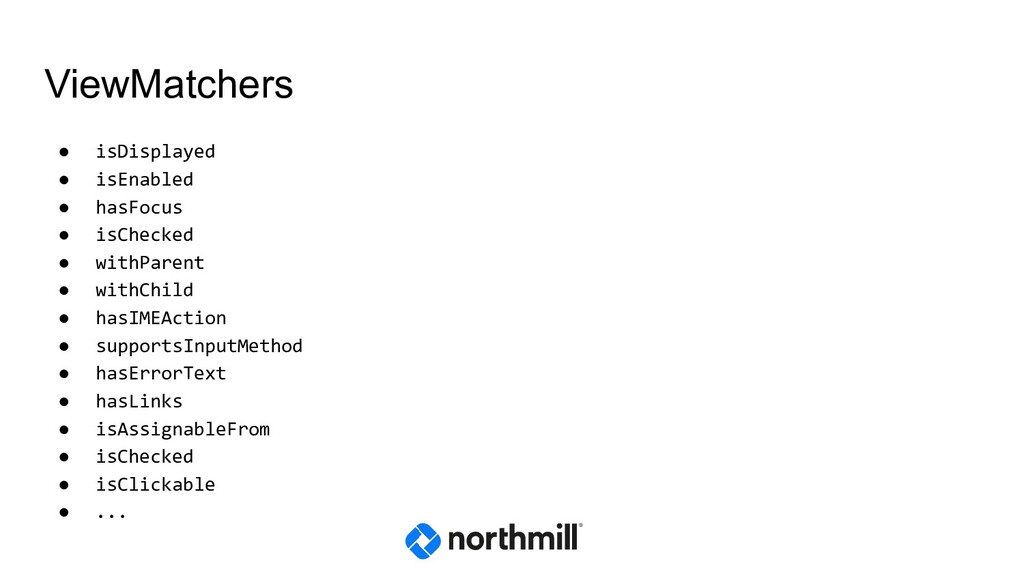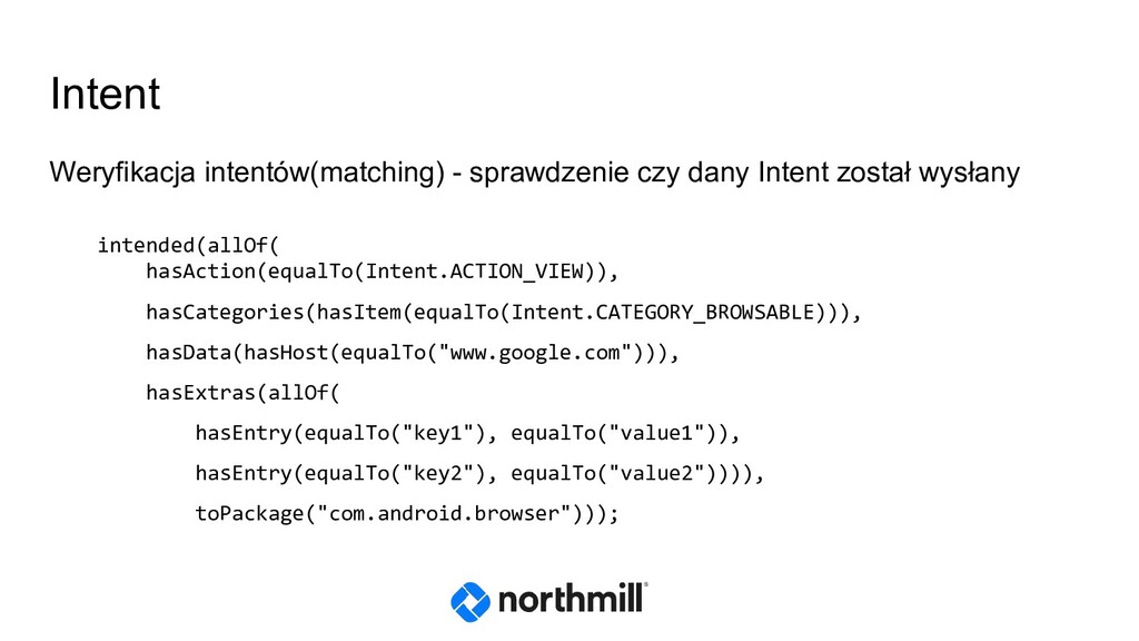 matcherów TypeSafeMatcher<T> - null safe BoundedMatcher<T,S extends T> - Matcher(z Espresso) dla typu T, który pozwala nam zawęzić obiekt do pewnego podtypu T np. BoundedMatcher<View, TextView>