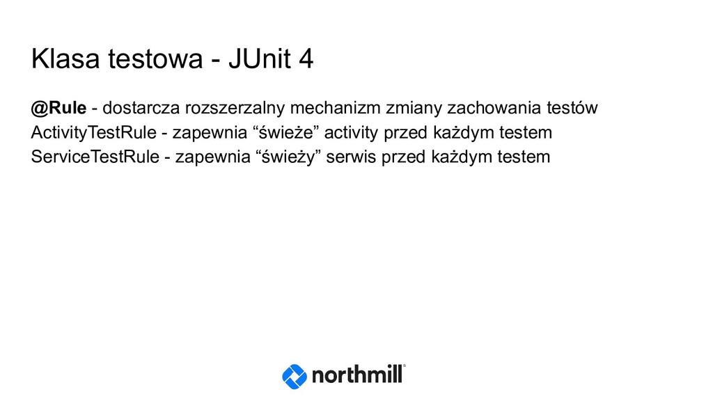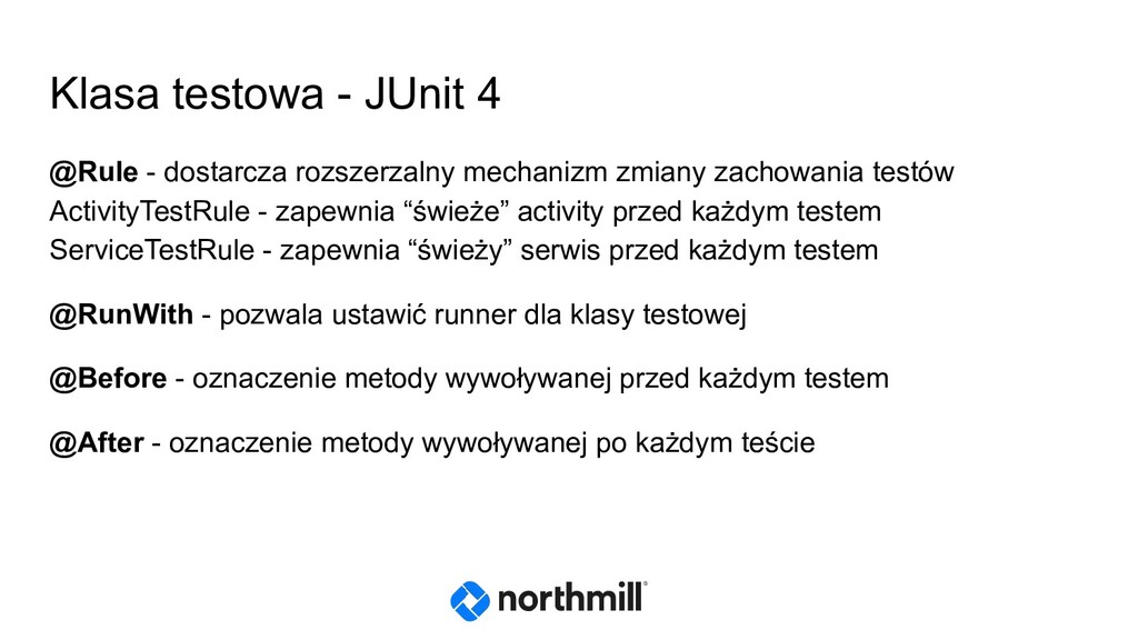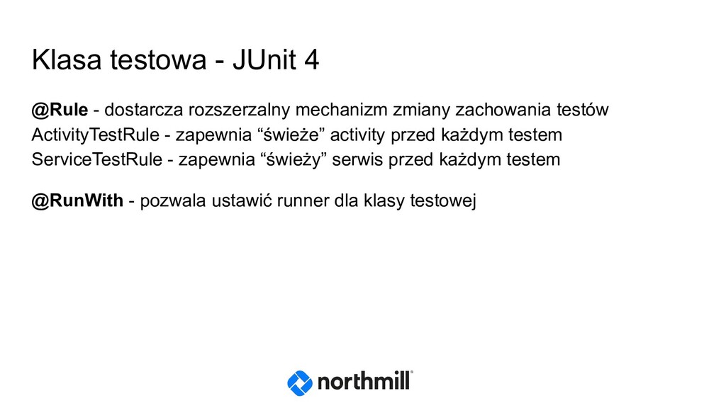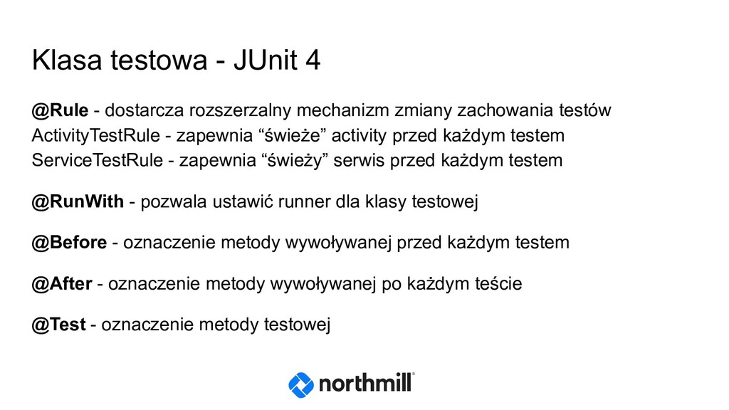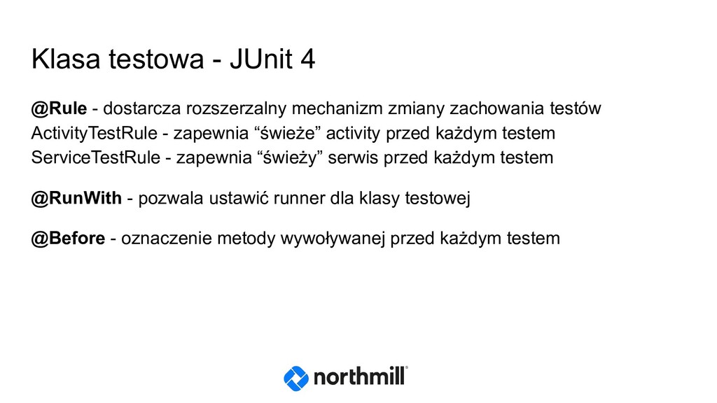 zmiany zachowania testów ActivityTestRule - zapewnia “świeże” activity przed każdym testem ServiceTestRule - zapewnia “świeży” serwis przed każdym testem @RunWith - pozwala ustawić runner dla klasy testowej @Before - oznaczenie metody wywoływanej przed każdym testem @After - oznaczenie metody wywoływanej po każdym teście @Test - oznaczenie metody testowej