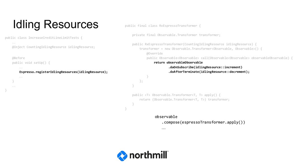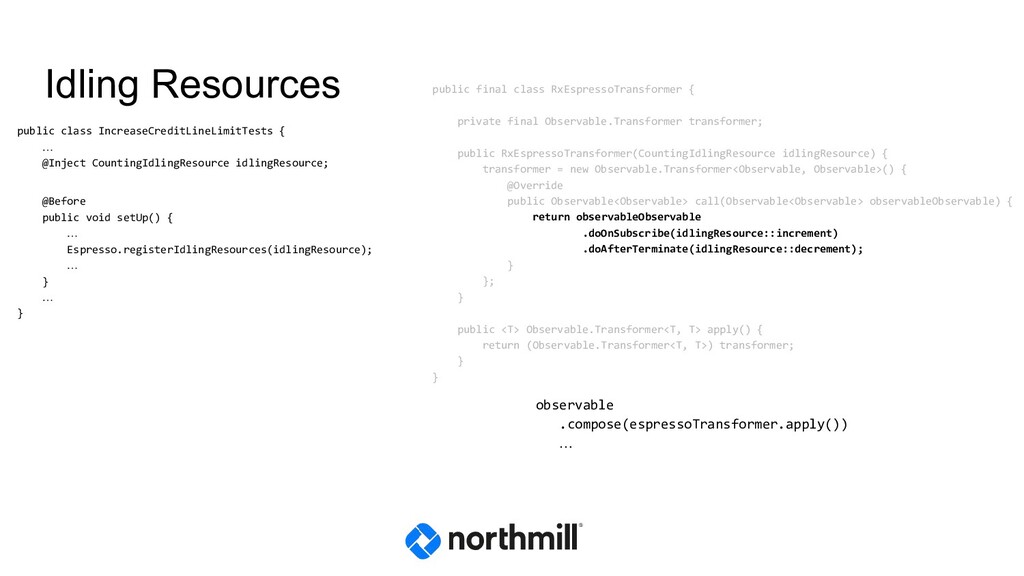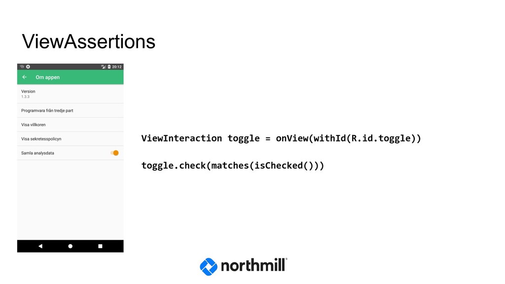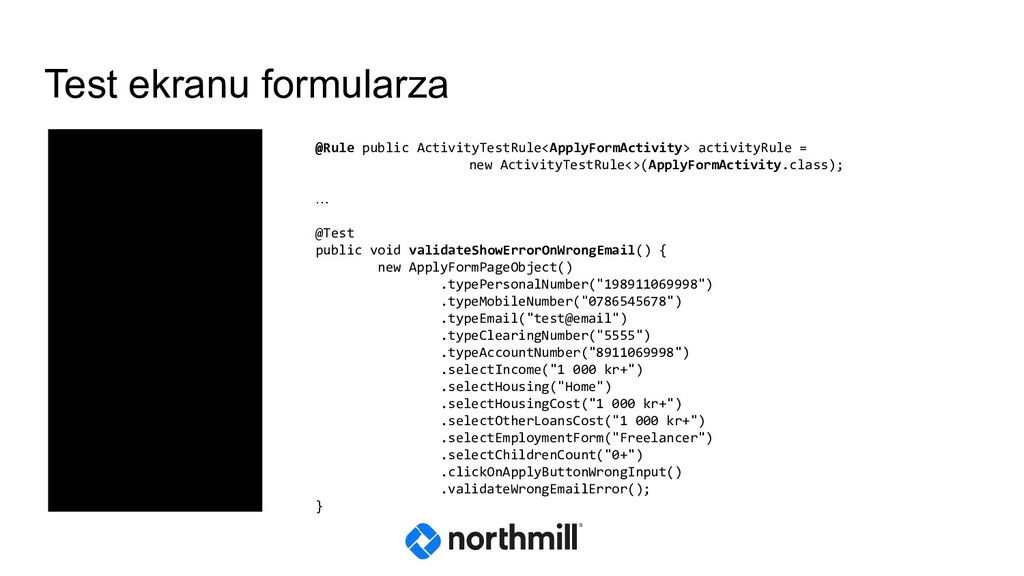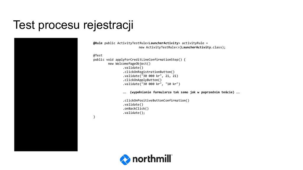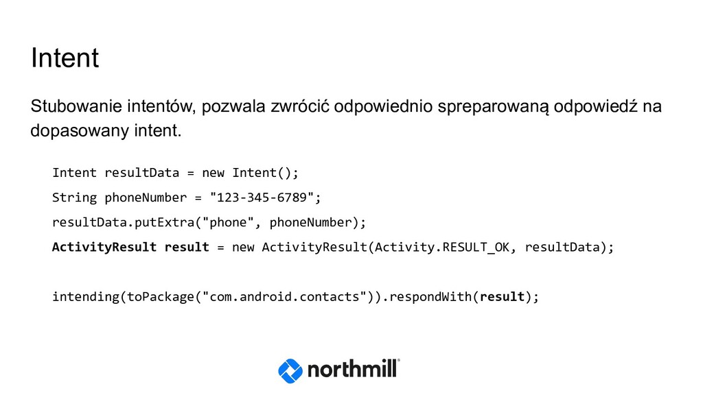 zmiany zachowania testów ActivityTestRule - zapewnia “świeże” activity przed każdym testem ServiceTestRule - zapewnia “świeży” serwis przed każdym testem @RunWith - pozwala ustawić runner dla klasy testowej @Before - oznaczenie metody wywoływanej przed każdym testem @After - oznaczenie metody wywoływanej po każdym teście @Test - oznaczenie metody testowej
