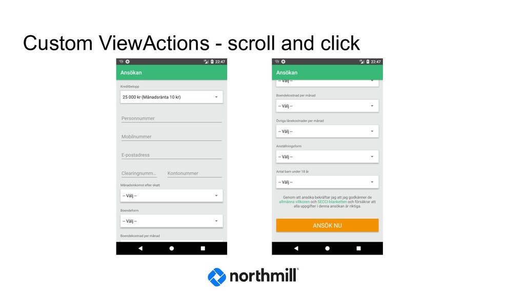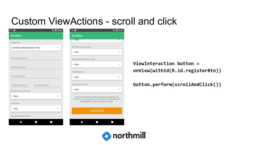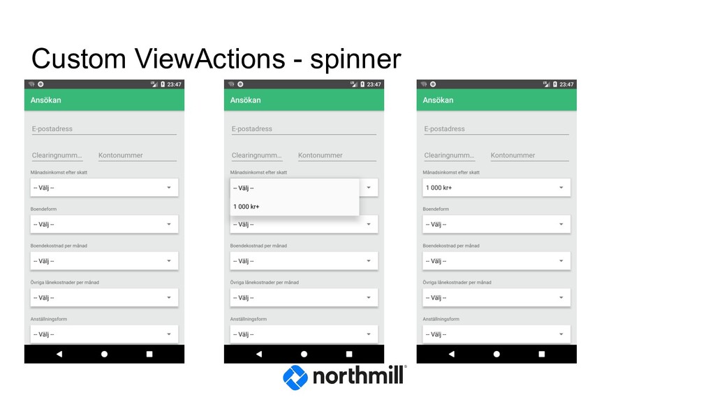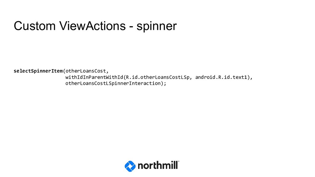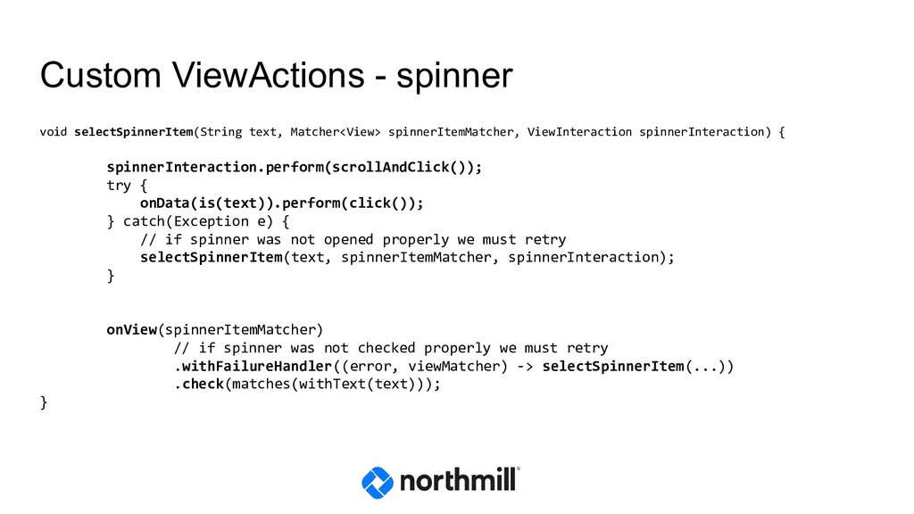spinnerInteraction) { spinnerInteraction.perform(scrollAndClick()); try { onData(is(text)).perform(click()); } catch(Exception e) { // if spinner was not opened properly we must retry selectSpinnerItem(text, spinnerItemMatcher, spinnerInteraction); } onView(spinnerItemMatcher) // if spinner was not checked properly we must retry .withFailureHandler((error, viewMatcher) -> selectSpinnerItem(...)) .check(matches(withText(text))); }