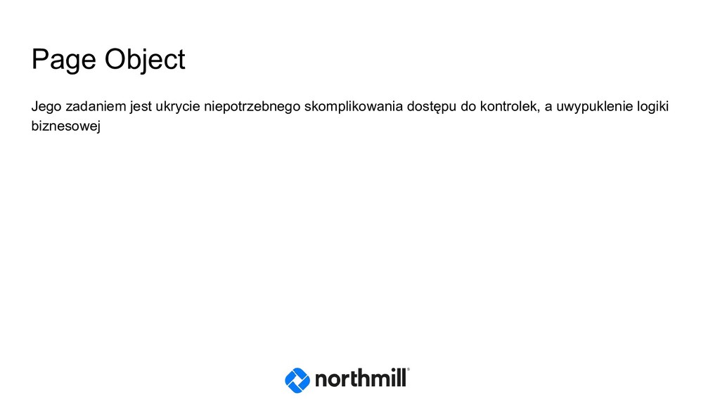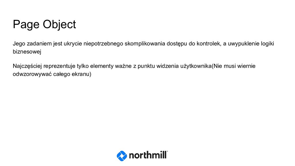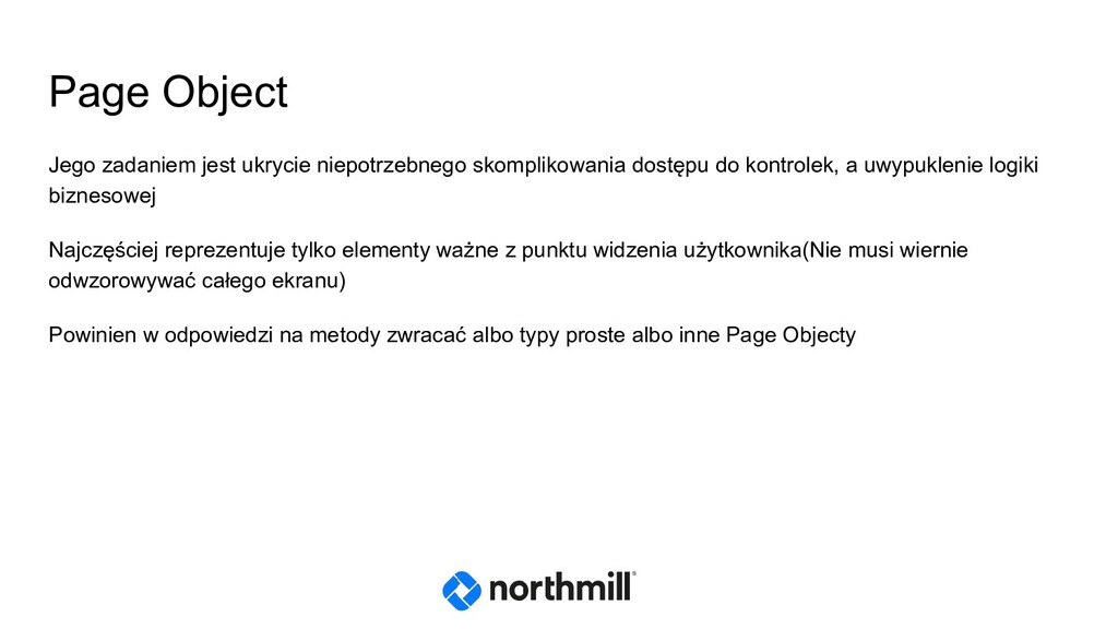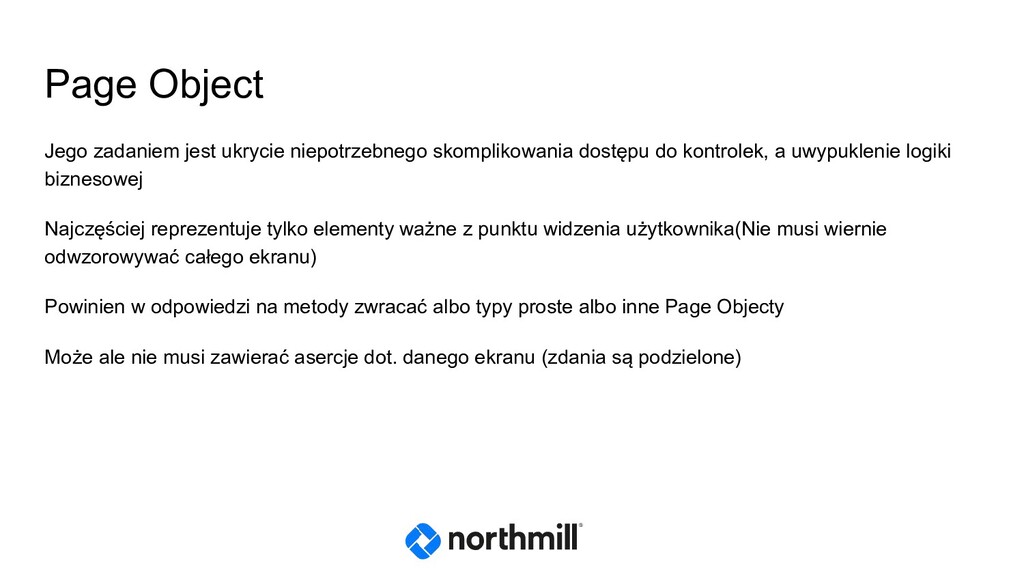kontrolek, a uwypuklenie logiki biznesowej Najczęściej reprezentuje tylko elementy ważne z punktu widzenia użytkownika(Nie musi wiernie odwzorowywać całego ekranu) Powinien w odpowiedzi na metody zwracać albo typy proste albo inne Page Objecty Może ale nie musi zawierać asercje dot. danego ekranu (zdania są podzielone)