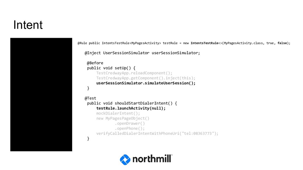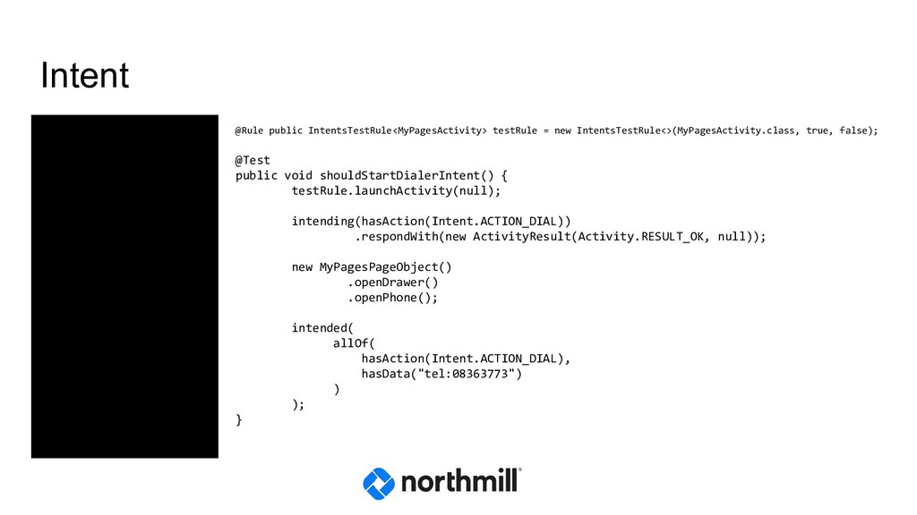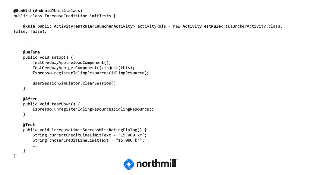 zmiany zachowania testów ActivityTestRule - zapewnia “świeże” activity przed każdym testem ServiceTestRule - zapewnia “świeży” serwis przed każdym testem @RunWith - pozwala ustawić runner dla klasy testowej @Before - oznaczenie metody wywoływanej przed każdym testem