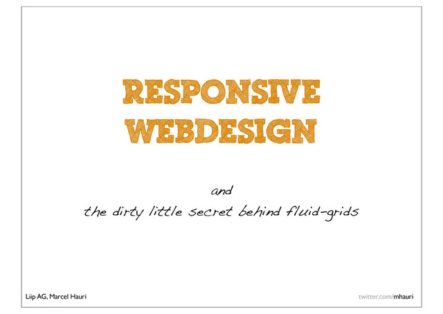 a flexible, grid layout get rid of pixel percise layouts, use percentages instead, like fluid grids • ... flexible images and media img, video, object {max-width:100%}; • ... Media Queries @media all and (min-width:500px) { ... your css code ... } • Depends on the Viewport. Definition of Responsive Webdesign by Ethan Marcotte