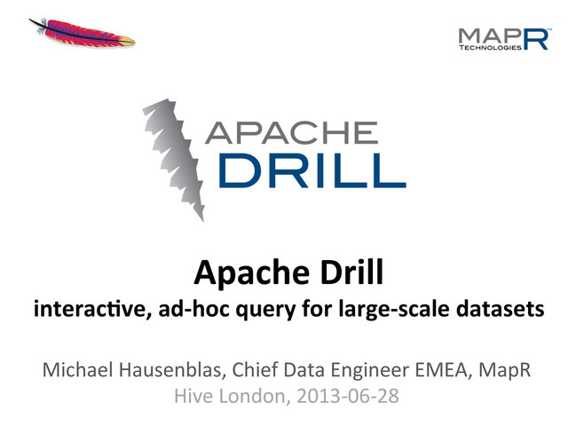 Talk about Apache Drill at Hive London. Besides the explanation of how Drill works and where we are at the moment I contrast Drill with Hive and show how they differ and where they overlap.