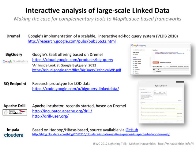 Talk -‐ Michael Hausenblas -‐ h;p://mhausenblas.info/#i Dremel Impala Apache Drill BQ Endpoint BigQuery Making the case for complementary tools to MapReduce-‐based frameworks Based on Hadoop/HBase-‐based, source available via GitHub h;p://blog.cloudera.com/blog/2012/10/cloudera-‐impala-‐real-‐Jme-‐queries-‐in-‐apache-‐hadoop-‐for-‐real/ Apache Incubator, recently started, based on Dremel h;p://incubator.apache.org/drill/ h;p://drill-‐user.org/ Google’s implementaJon of a scalable, interacJve ad-‐hoc query system (VLDB 2010) h;p://research.google.com/pubs/pub36632.html Google’s SaaS offering based on Dremel h;ps://cloud.google.com/products/big-‐query ‘An Inside Look at Google BigQuery’ 2012 h;ps://cloud.google.com/files/BigQueryTechnicalWP.pdf Research prototype for LOD data h;ps://code.google.com/p/bigquery-‐linkeddata/