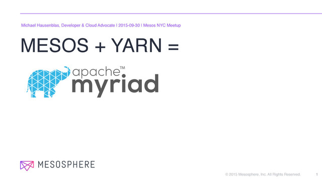 GREAT ECO SYSTEMS 3 Apache Mesos ecosystem Marathon, Kubernetes, Chronos, Elasticsearch, C*, Jenkins, Spark, MySQL, ArangoDB, Quobyte, Ceph, etc. Apache Hadoop & YARN ecosystem MapReduce, Hive, Spark, HBase, Impala, etc. Apache Myriad enables you to benefit from both ecosystems without code changes to neither Mesos or YARN