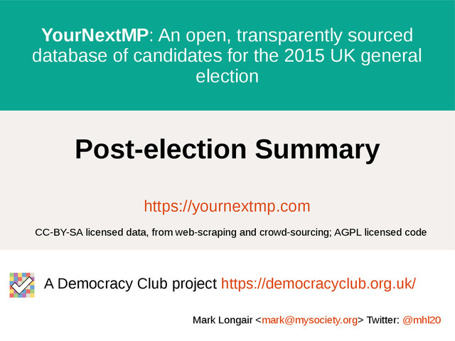 Andy Lulham, Zarino Zappia, Liz Conlan, Martin Wright • Matthew Somerville, Chris Mytton, James Baster PopIt developers: • Chris Mytton and Struan Donald Amazing volunteers: • andylolz, tfgg, JPCarrington, edent, RichCBury1, TimPatmore, sjorford, symroe, mattl, and many more Democracy Club: Joe Mitchell, Emily Randall Full Fact: Will Moy, Mevan Babakar For more information: • Democracy Club: https://democracyclub.org.uk/ Mark Longair <[email protected]> Twitter: @mhl20