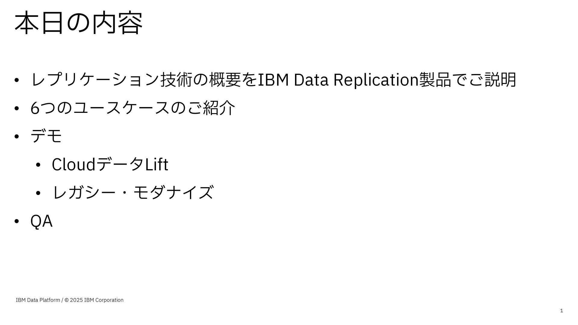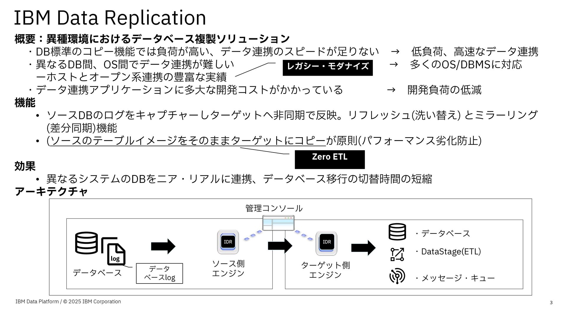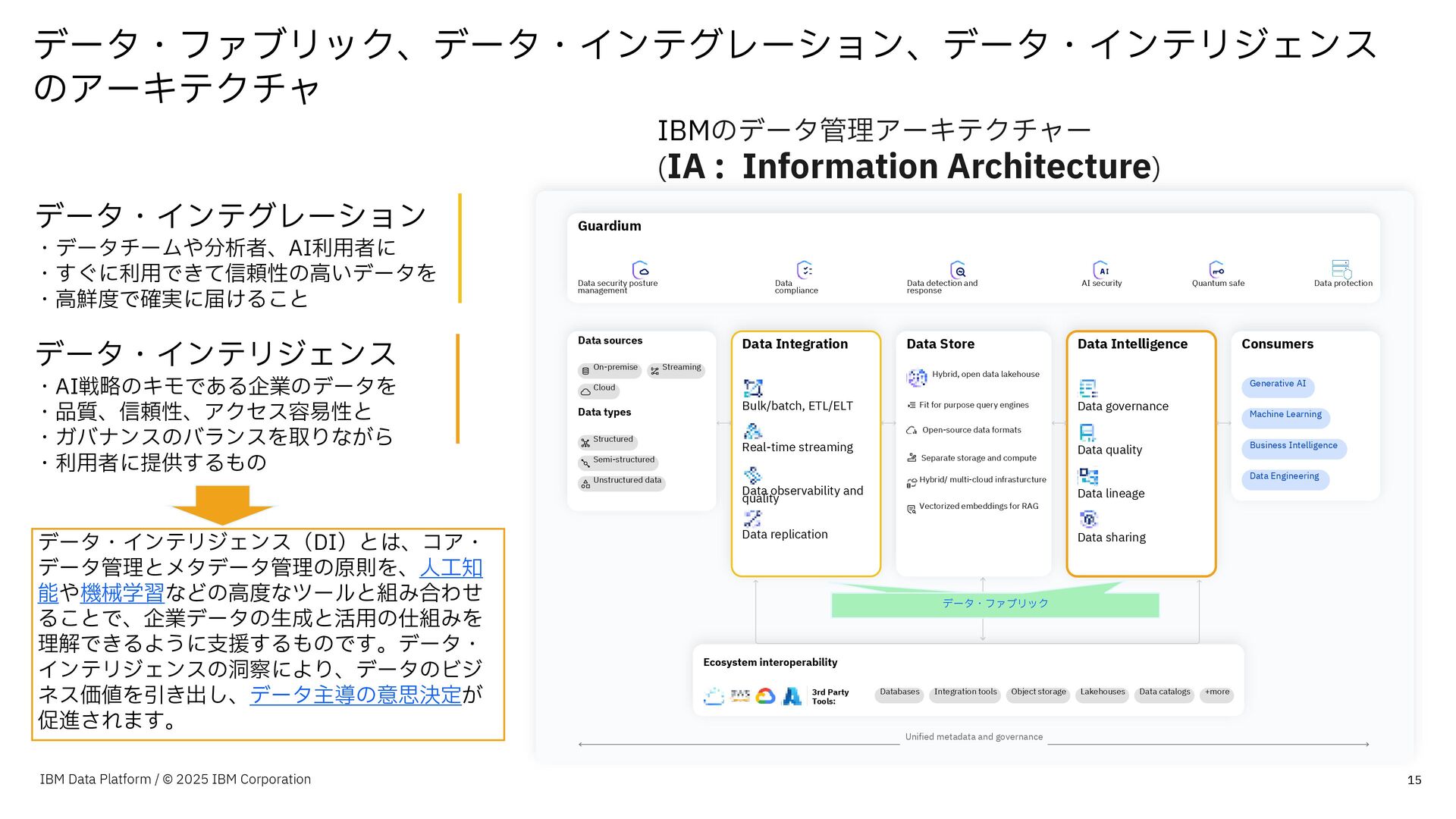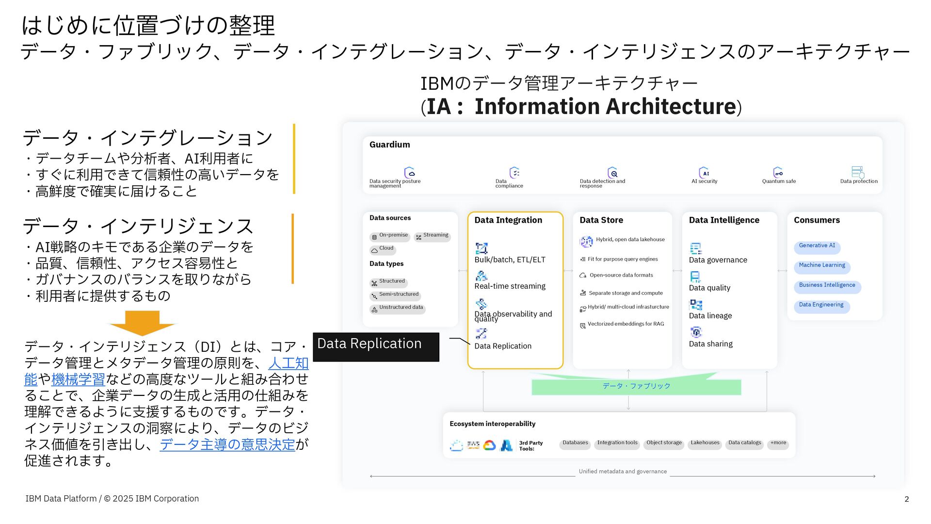 sources On-premise Streaming Cloud Data types Structured Semi-structured Unstructured data Data Integration Bulk/batch, ETL/ELT Real-time streaming Data observability and quality Data Replication Data Store Hybrid, open data lakehouse Fit for purpose query engines Open-source data formats Separate storage and compute Hybrid/ multi-cloud infrasturcture Vectorized embeddings for RAG Data Intelligence Data governance Data quality Data lineage Data sharing Consumers Generative AI Machine Learning Business Intelligence Data Engineering Ecosystem interoperability 3rd Party Tools: Databases Integration tools Object storage Lakehouses Data catalogs +more Unified metadata and governance Guardium Data security posture management Data compliance Data detection and response AI security Quantum safe Data protection データ・ファブリック はじめに位置づけの整理 データ・ファブリック、データ・インテグレーション、データ・インテリジェンスのアーキテクチャー データ・インテグレーション ・データチームや分析者、AI利用者に ・すぐに利用できて信頼性の高いデータを ・高鮮度で確実に届けること データ・インテリジェンス ・AI戦略のキモである企業のデータを ・品質、信頼性、アクセス容易性と ・ガバナンスのバランスを取りながら ・利用者に提供するもの データ・インテリジェンス(DI)とは、コア・ データ管理とメタデータ管理の原則を、人工知 能や機械学習などの高度なツールと組み合わせ ることで、企業データの生成と活用の仕組みを 理解できるように支援するものです。データ・ インテリジェンスの洞察により、データのビジ ネス価値を引き出し、データ主導の意思決定が 促進されます。 IBMのデータ管理アーキテクチャー (IA : Information Architecture) Data Replication