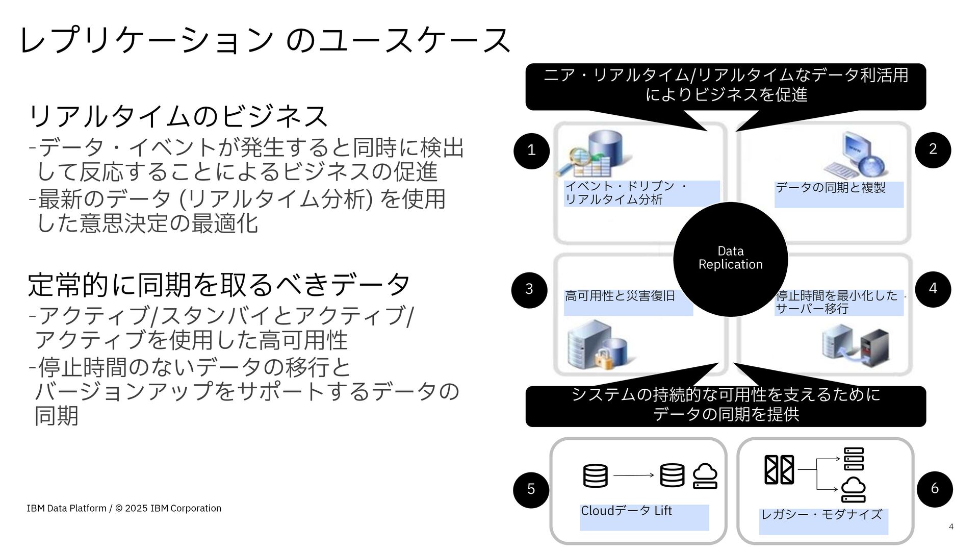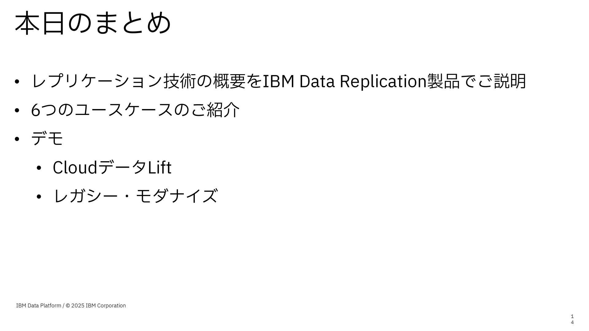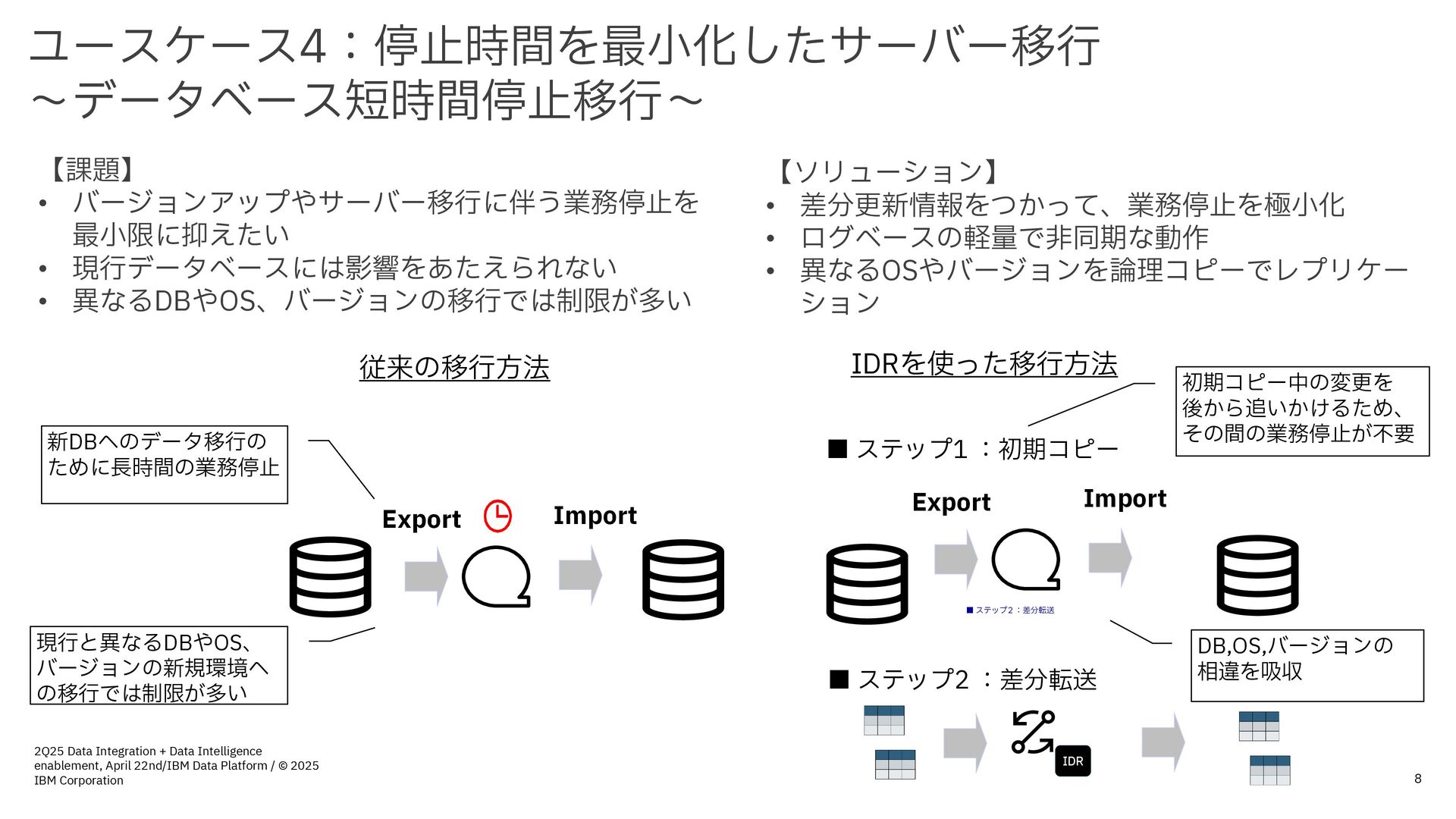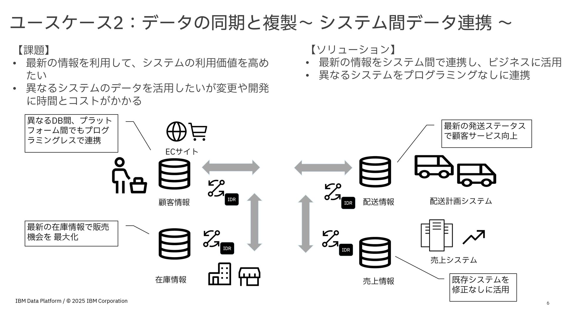 sources On-premise Streaming Cloud Data types Structured Semi-structured Unstructured data Data Integration Bulk/batch, ETL/ELT Real-time streaming Data observability and quality Data Replication Data Store Hybrid, open data lakehouse Fit for purpose query engines Open-source data formats Separate storage and compute Hybrid/ multi-cloud infrasturcture Vectorized embeddings for RAG Data Intelligence Data governance Data quality Data lineage Data sharing Consumers Generative AI Machine Learning Business Intelligence Data Engineering Ecosystem interoperability 3rd Party Tools: Databases Integration tools Object storage Lakehouses Data catalogs +more Unified metadata and governance Guardium Data security posture management Data compliance Data detection and response AI security Quantum safe Data protection データ・ファブリック はじめに位置づけの整理 データ・ファブリック、データ・インテグレーション、データ・インテリジェンスのアーキテクチャー データ・インテグレーション ・データチームや分析者、AI利用者に ・すぐに利用できて信頼性の高いデータを ・高鮮度で確実に届けること データ・インテリジェンス ・AI戦略のキモである企業のデータを ・品質、信頼性、アクセス容易性と ・ガバナンスのバランスを取りながら ・利用者に提供するもの データ・インテリジェンス(DI)とは、コア・ データ管理とメタデータ管理の原則を、人工知 能や機械学習などの高度なツールと組み合わせ ることで、企業データの生成と活用の仕組みを 理解できるように支援するものです。データ・ インテリジェンスの洞察により、データのビジ ネス価値を引き出し、データ主導の意思決定が 促進されます。 IBMのデータ管理アーキテクチャー (IA : Information Architecture) Data Replication