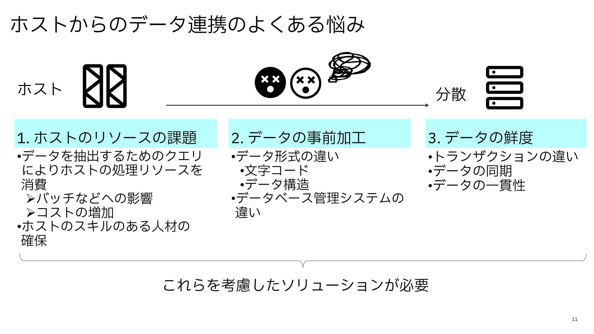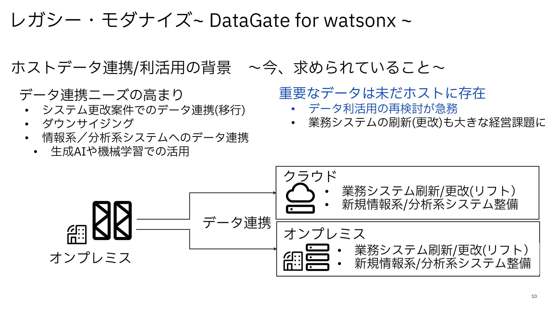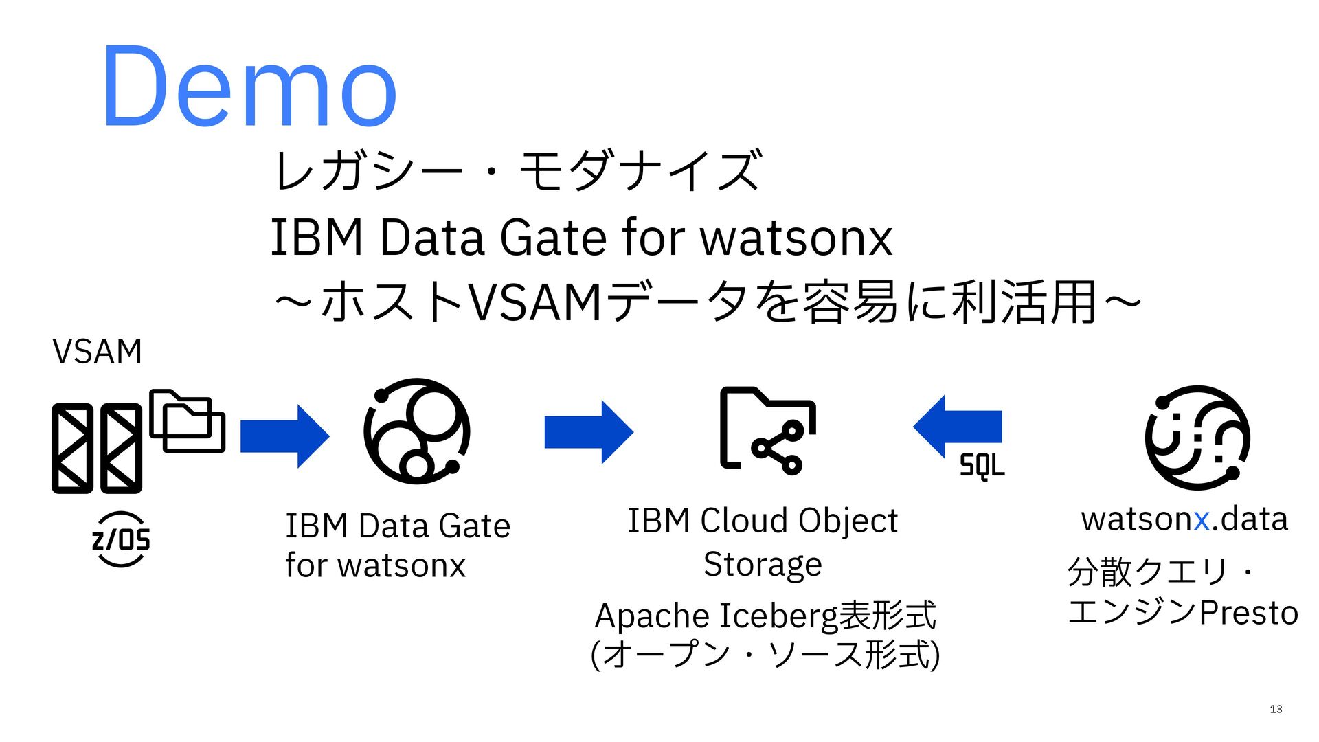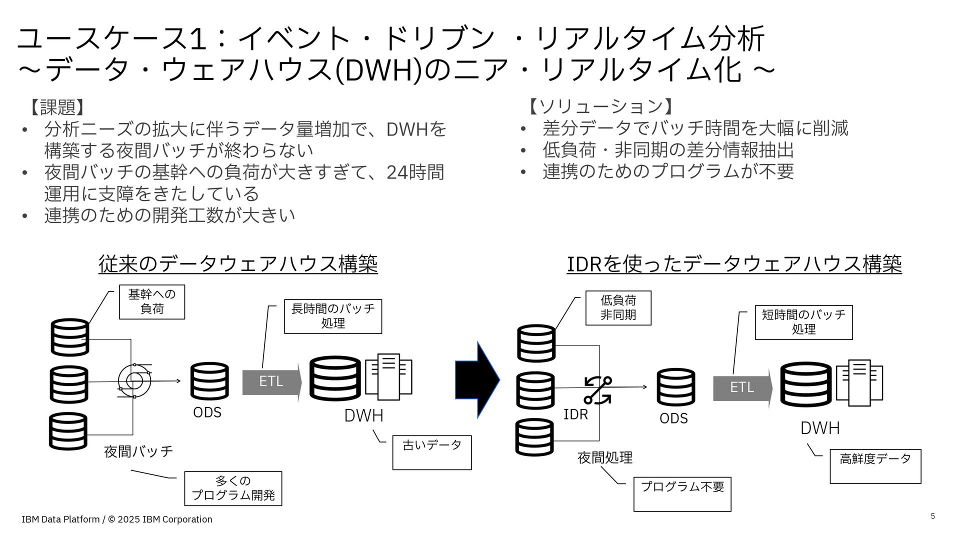 sources On-premise Streaming Cloud Data types Structured Semi-structured Unstructured data Data Integration Bulk/batch, ETL/ELT Real-time streaming Data observability and quality Data Replication Data Store Hybrid, open data lakehouse Fit for purpose query engines Open-source data formats Separate storage and compute Hybrid/ multi-cloud infrasturcture Vectorized embeddings for RAG Data Intelligence Data governance Data quality Data lineage Data sharing Consumers Generative AI Machine Learning Business Intelligence Data Engineering Ecosystem interoperability 3rd Party Tools: Databases Integration tools Object storage Lakehouses Data catalogs +more Unified metadata and governance Guardium Data security posture management Data compliance Data detection and response AI security Quantum safe Data protection データ・ファブリック はじめに位置づけの整理 データ・ファブリック、データ・インテグレーション、データ・インテリジェンスのアーキテクチャー データ・インテグレーション ・データチームや分析者、AI利用者に ・すぐに利用できて信頼性の高いデータを ・高鮮度で確実に届けること データ・インテリジェンス ・AI戦略のキモである企業のデータを ・品質、信頼性、アクセス容易性と ・ガバナンスのバランスを取りながら ・利用者に提供するもの データ・インテリジェンス(DI)とは、コア・ データ管理とメタデータ管理の原則を、人工知 能や機械学習などの高度なツールと組み合わせ ることで、企業データの生成と活用の仕組みを 理解できるように支援するものです。データ・ インテリジェンスの洞察により、データのビジ ネス価値を引き出し、データ主導の意思決定が 促進されます。 IBMのデータ管理アーキテクチャー (IA : Information Architecture) Data Replication