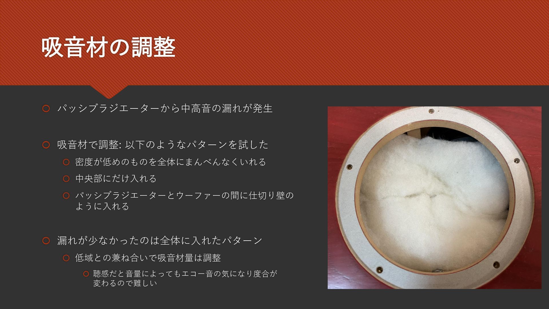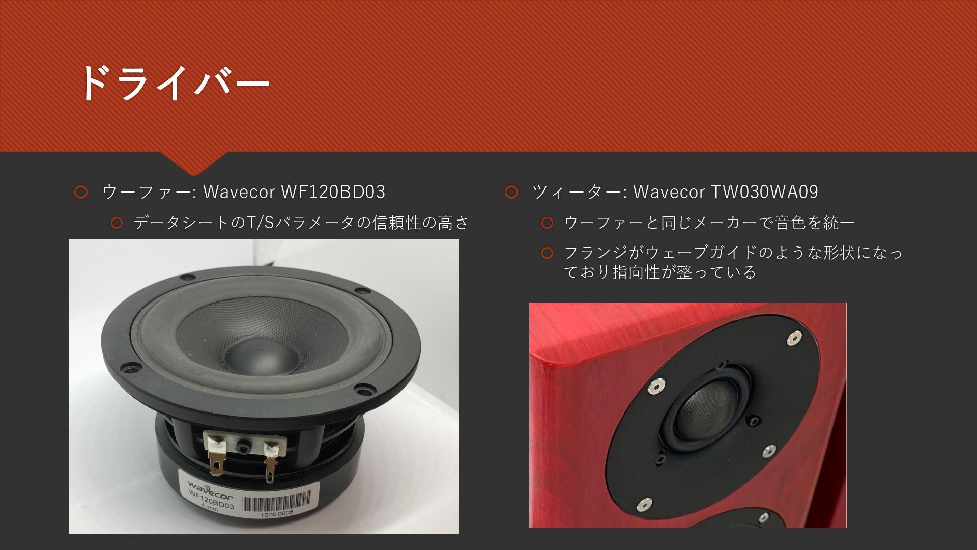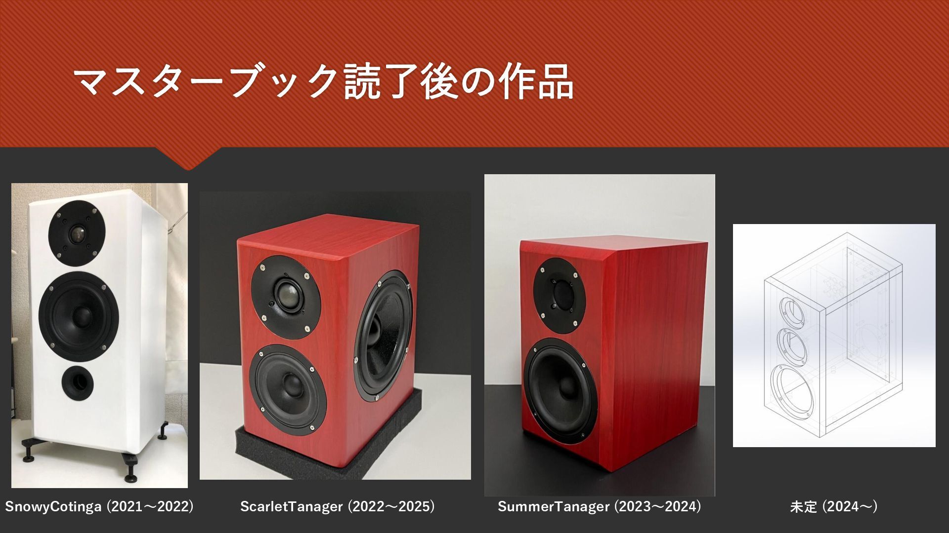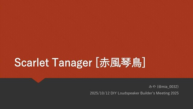 2025/10/12に大阪で開催されたDIY Loudspeaker Builder’s Meeting 2025に登壇した際のスライドです。 デスクトップに置けるサイズのパッシブラジエーター型2wayスピーカーScarlet Tanagerについての発表です。