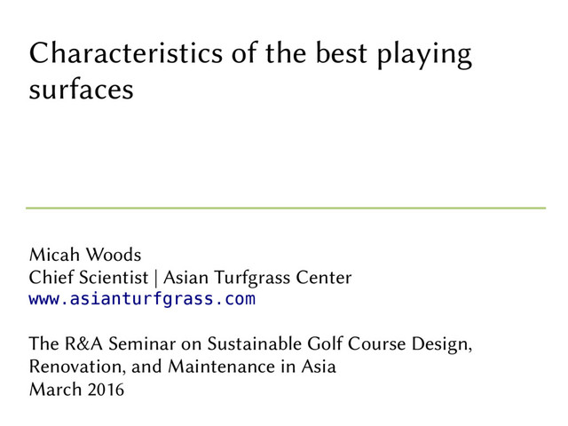 Discusses the playing surfaces for golf and their characteristics. Presented in Beijing and Bangkok at The R&A Seminar on Sustainable Golf Course Design, Renovation, and Maintenance in Asia.