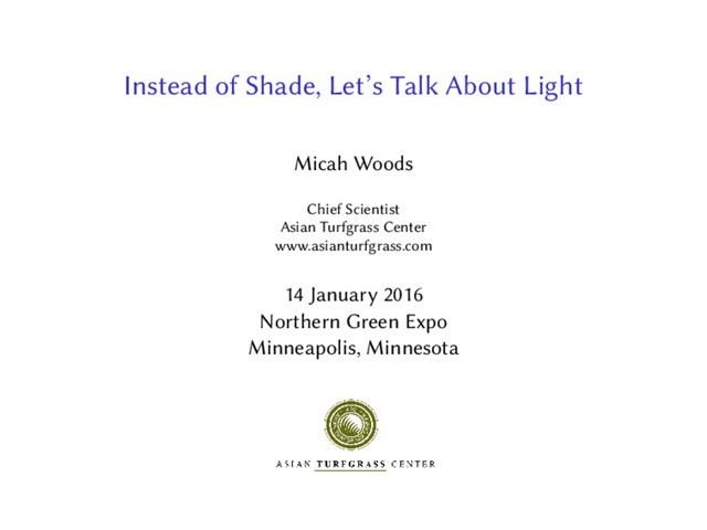 Shade from trees, buildings, clouds or mountains affects a lot of turfgrass areas, and shade can make it impossible to produce the desired turfgrass conditions. Rather than talk about the impossible, in this presentation I talk about light. Specifically, I discuss photosynthetically active radiation (PAR), the photosynthetic photon flux density (PPFD), and the daily light integral (DLI). These sound complicated but are quite simple and can be easily measured or estimated. With an understanding and ability to measure and communicate about PAR, PPFD, and DLI, it makes it a lot easier to manage those previously impossible shade problems.