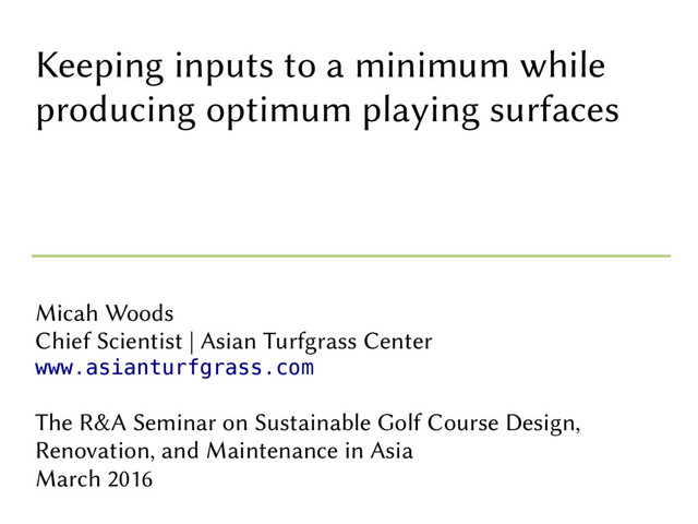 Presented on 10 March 2016 in Thailand as part of the R&A Seminar on Sustainable Golf Course Design, Renovation and Maintenance in Asia. This discusses playing surfaces for golf, what the conditions should be, some advice on how those conditions can be achieved, or adjusted closer to the desired conditions, and in particular explains how this can be done with a minimum of inputs such as water, fertilizer, energy, and pesticides.
