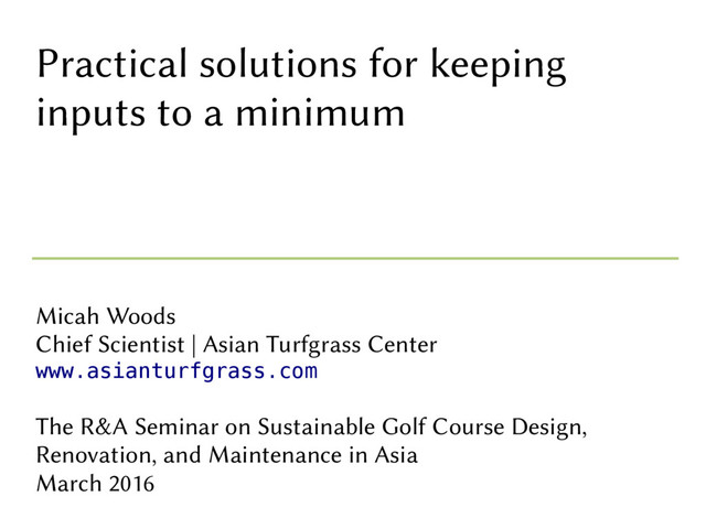 Discusses things that can be done to reduce inputs during golf course construction and during operation of the course after opening. Presented in Beijing and Bangkok at The R&A Seminar on Sustainable Golf Course Design, Renovation, and Maintenance in Asia.