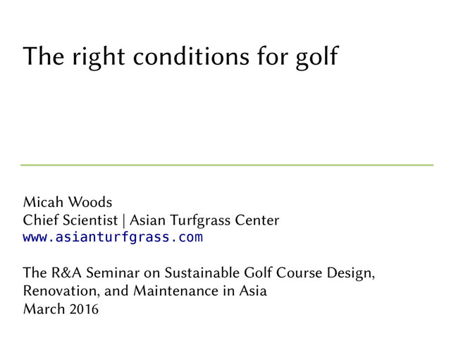 Discusses the soil and water conditions necessary for golf. Presented in Beijing and Bangkok at The R&A Seminar on Sustainable Golf Course Design, Renovation, and Maintenance in Asia