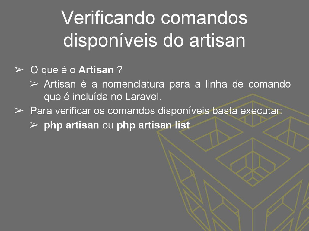 Artisan ? ➢ Artisan é a nomenclatura para a linha de comando que é incluída no Laravel. ➢ Para verificar os comandos disponíveis basta executar: ➢ php artisan ou php artisan list