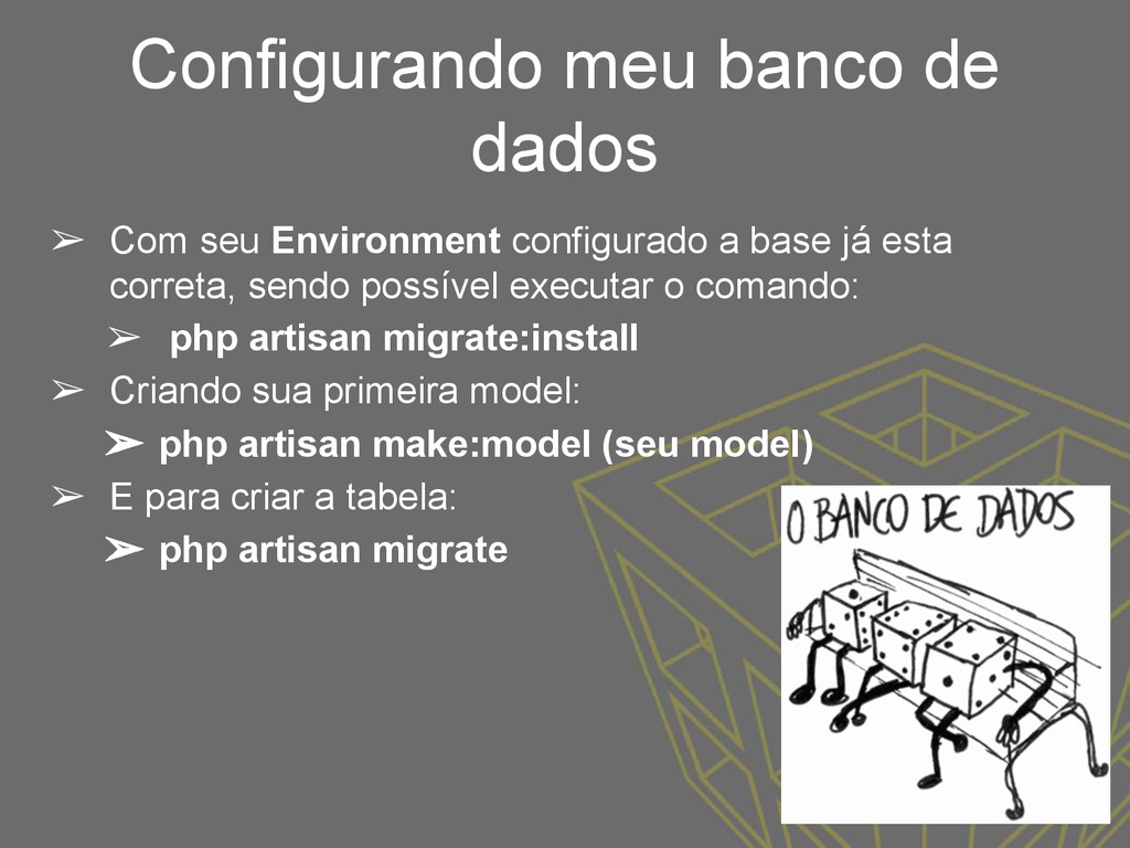 a base já esta correta, sendo possível executar o comando: ➢ php artisan migrate:install ➢ Criando sua primeira model: ➢ php artisan make:model (seu model) ➢ E para criar a tabela: ➢ php artisan migrate