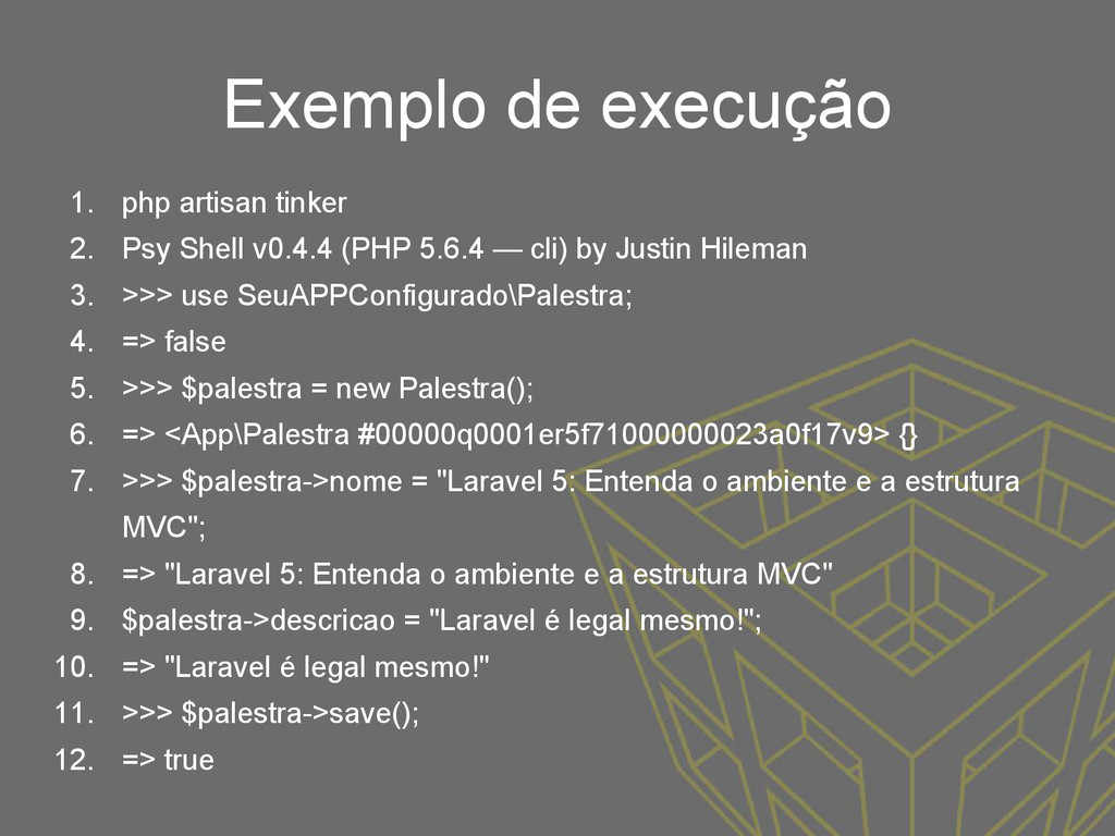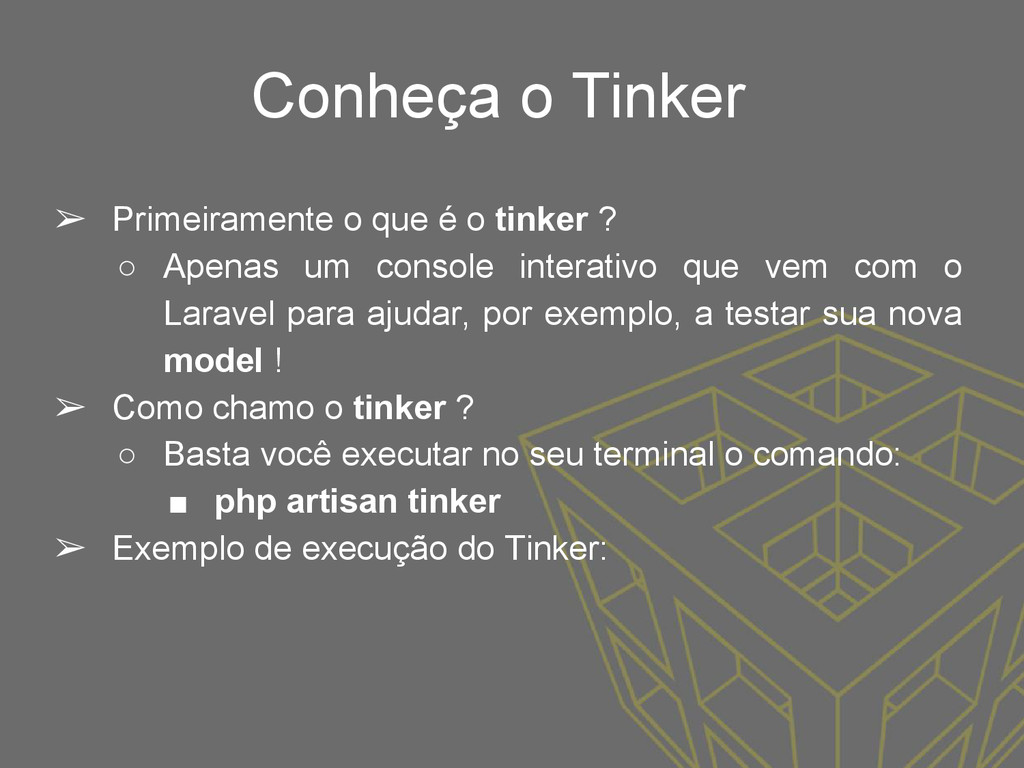 ? ◦ Apenas um console interativo que vem com o Laravel para ajudar, por exemplo, a testar sua nova model ! ➢ Como chamo o tinker ? ◦ Basta você executar no seu terminal o comando: ▪ php artisan tinker ➢ Exemplo de execução do Tinker:
