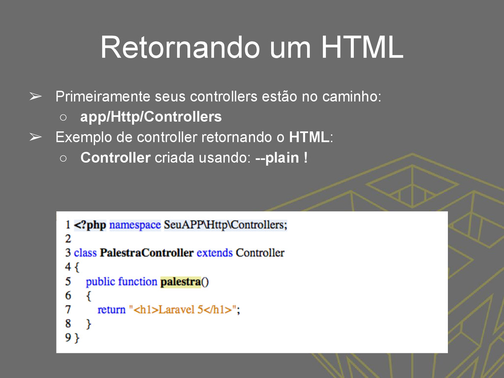 O caminho para o routes no Laravel 5 mudou para: ▪ app/Http/routes.php ➢ Tipos de rotas Laravel ◦ GET, POST, PUT E DELETE ➢ E como eu forneço um parâmetro em minha rota ? ◦ Basta que em sua rota você informe o parâmetro, por exemplo: rota/ {parametro} ◦ E para opcionais: rota/{parametro?} ◦ É possível utilizar rota?parametro=valor ! ➢ Agrupamento de rotas, será que vale a pena ? ◦ Nem deveria ter esse questionamento ! ◦ Como eu faço então ? ▪ O que precisa é usar o group da rota e especificar o nome do seu grupo: Route::group[‘as’ => ‘legal’] ➢ Apenas um lembrete funciona para: middleware e namespaces