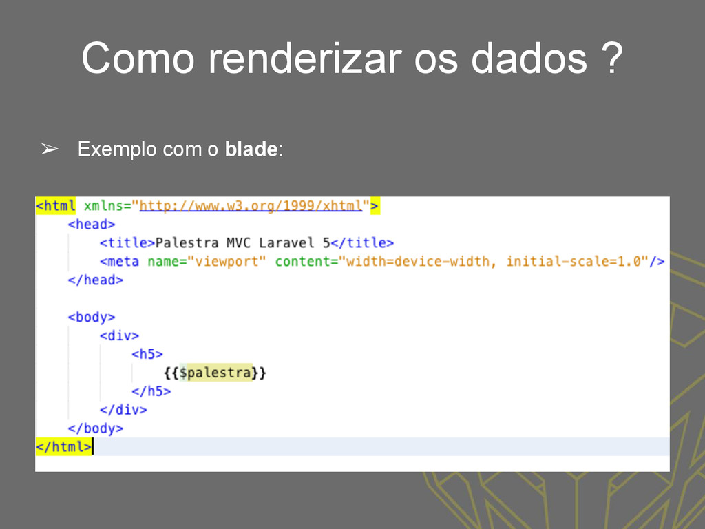 estão as Views ? ◦ No Laravel 5 nossas views ficam no caminho: ▪ resources \ ou recursos - resources/views ➢ A template engine que o Laravel utiliza é a blade, por isso em alguns arquivos existe: ◦ .blade.php ➢ Posso utilizar outro template engine ? - Sim ! ➢ Sou obrigado a utilizar .blade ? - Não, porém você perde os facilitadores do Laravel para inserção de códigos PHP.