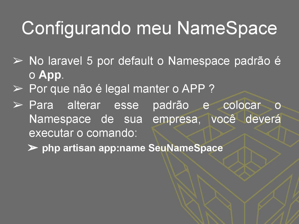 Namespace padrão é o App. ➢ Por que não é legal manter o APP ? ➢ Para alterar esse padrão e colocar o Namespace de sua empresa, você deverá executar o comando: ➢ php artisan app:name SeuNameSpace
