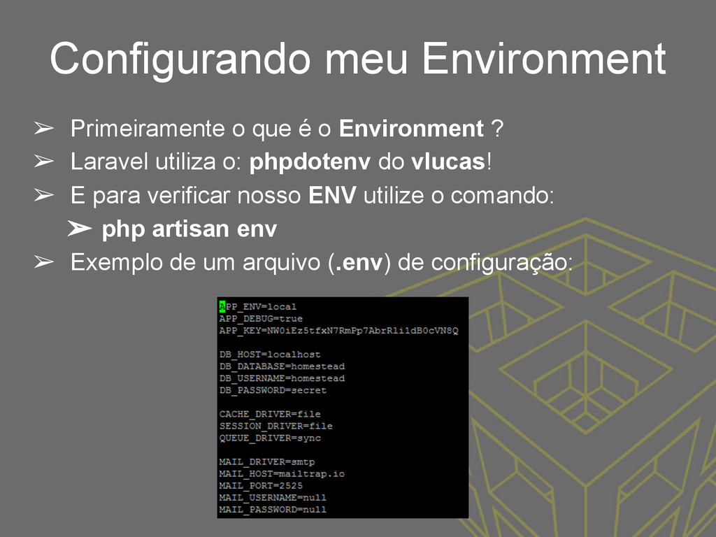 ? ➢ Laravel utiliza o: phpdotenv do vlucas! ➢ E para verificar nosso ENV utilize o comando: ➢ php artisan env ➢ Exemplo de um arquivo (.env) de configuração: