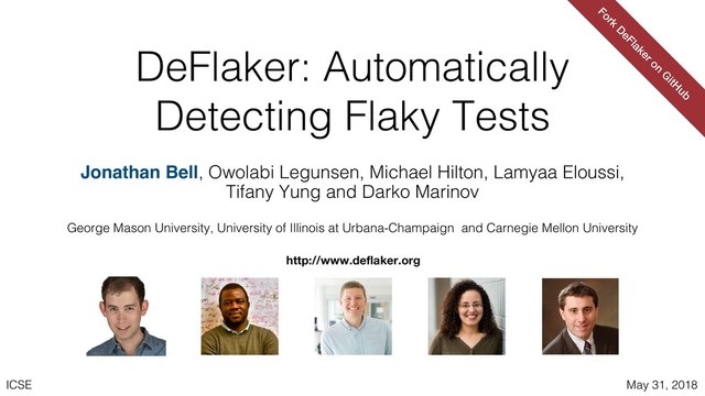 Bell, Owolabi Legunsen, Michael Hilton, Lamyaa Eloussi, Tifany Yung and Darko Marinov George Mason University, University of Illinois at Urbana-Champaign and Carnegie Mellon University http://www.deflaker.org Fork D eFlaker on G itH ub