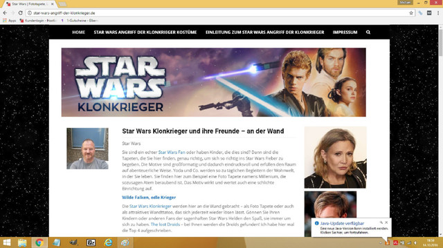 Wär das nicht Cool wenn du dein Zimmer,Wohnzimmer,Schlafzimmer mit einer Tapete von Star Wars Tapezieren kannst und da zu passend eine Lampe von Star Wars,so fühlst du dich wie in einer Galaxy,es gibt Jacken, Schulränzel,Kostüme und vieles mehr, wenn du Interesse hast dann klicke auf den Link. http://star-wars-angriff-der-klonkrieger.de/